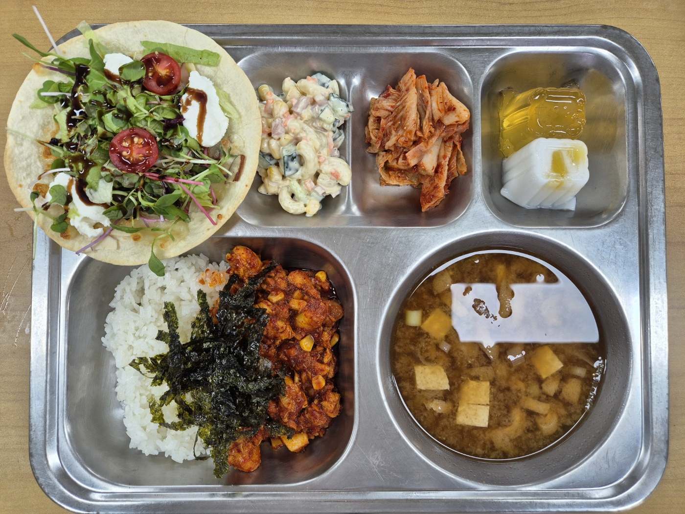 [석식] 닭살야채볶음덮밥, 유부장국, 리코타치즈피자, 마카로니샐러드, 배추김치, 요거트*애플라임푸딩