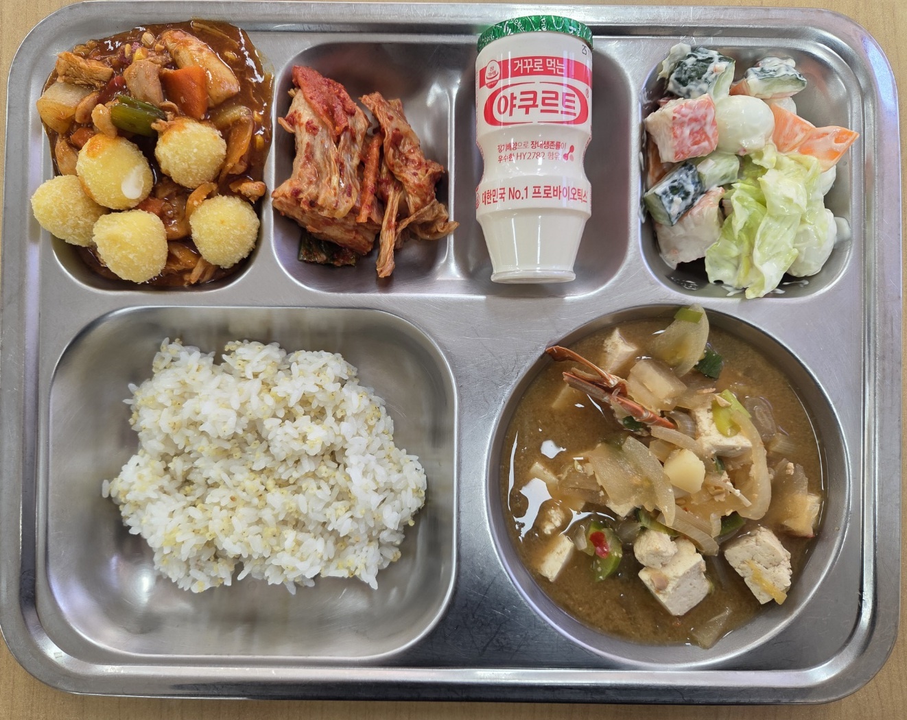 [중식] 기장밥, 꽃게두부된장국, 치즈볼불닭볶음, 꽃맛살샐러드, 배추김치, 거꾸로요구르트