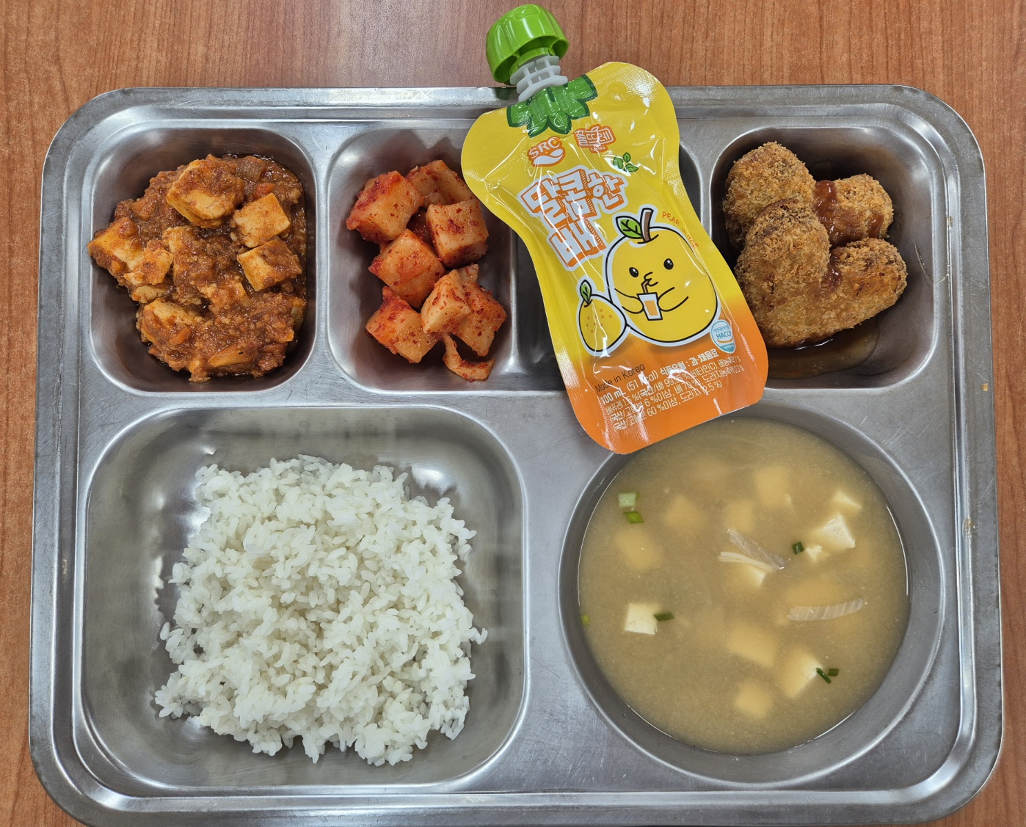 [석식] 새우볶음밥, 미소된장국, 돈안심카츠, 마파두부, 깍두기, 배도라지주스