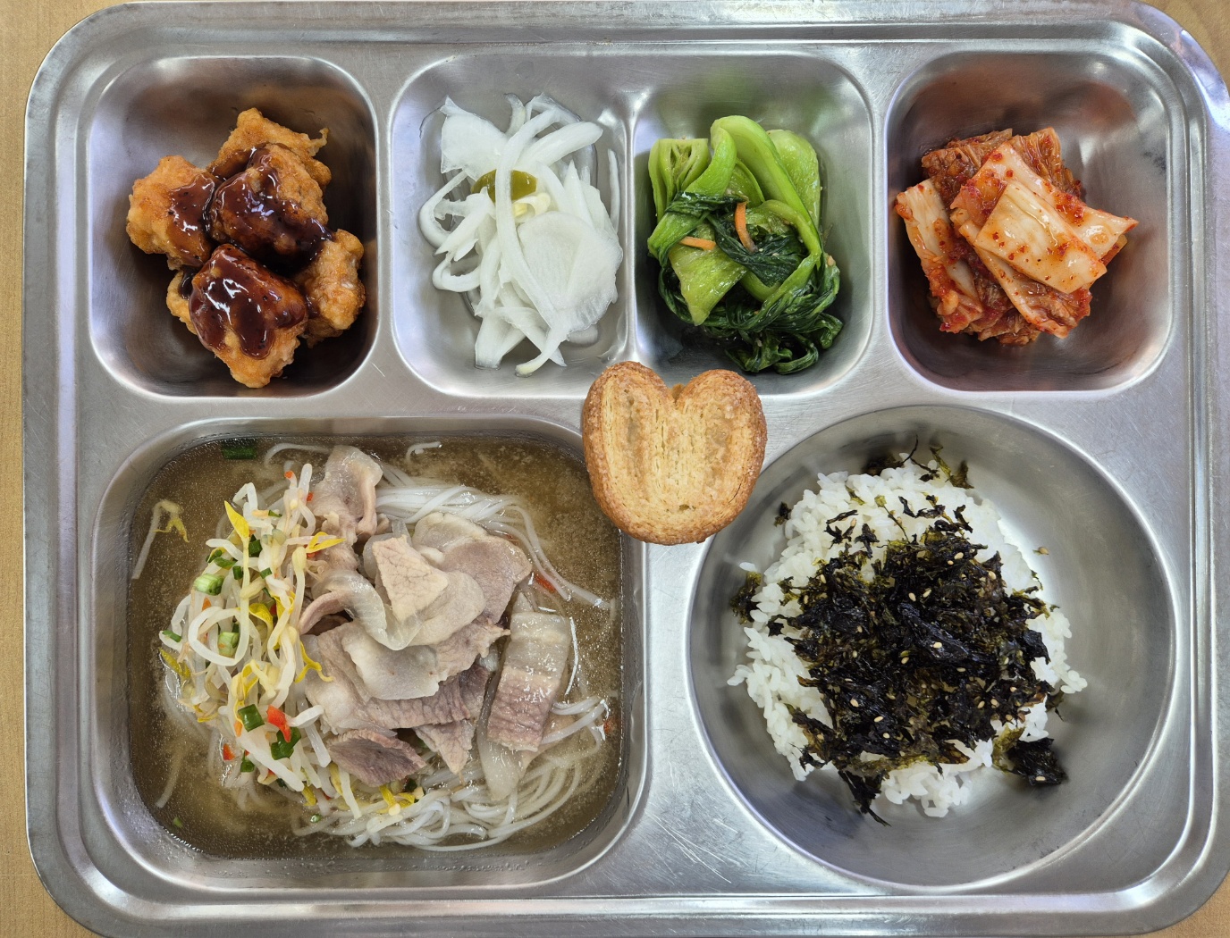 [중식] 미니밥*파래자반(자율), 용남쌀국수, 블랙패퍼 등심돈강정, 양파초절임(자율), 청경채볶음,배추김치, 하트파이