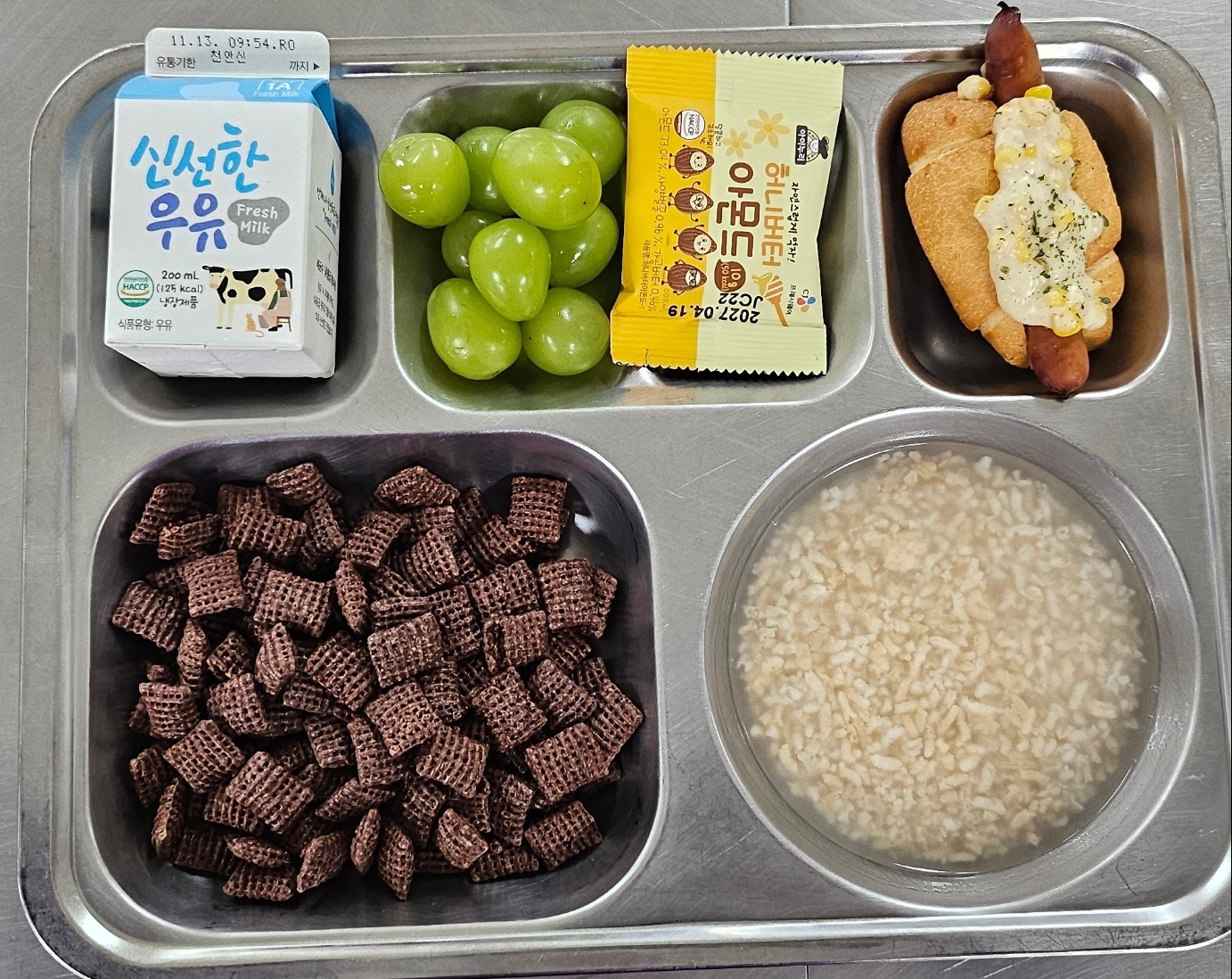 [조식] 어니언크림소금빵도그, 숭늉, 샤인머스켓, 우유, 초코첵스시리얼, 허니버터아몬드