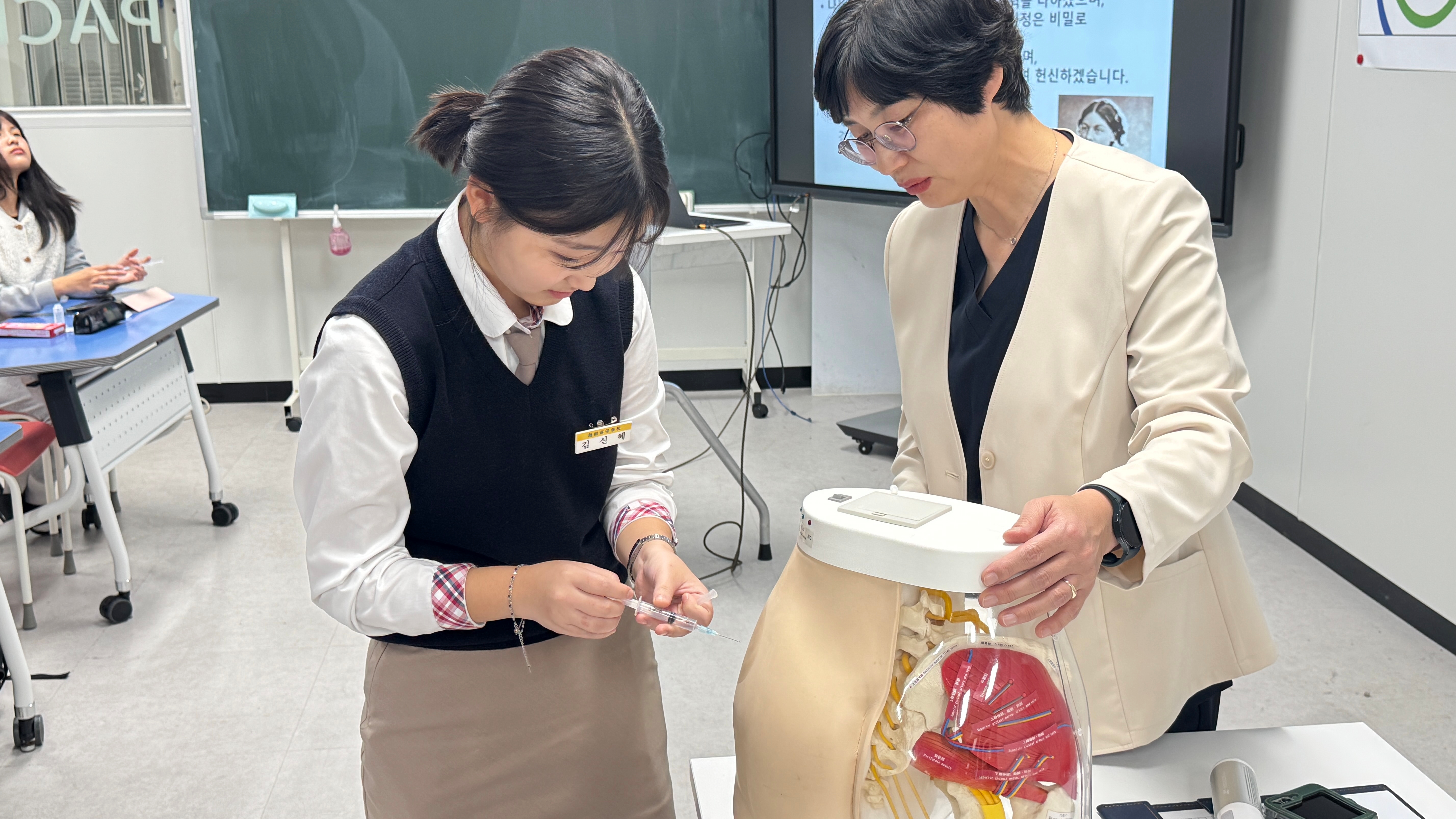 강연과 더불어 학생들과 함께 근육주사 실습까지 진행하였습니다.