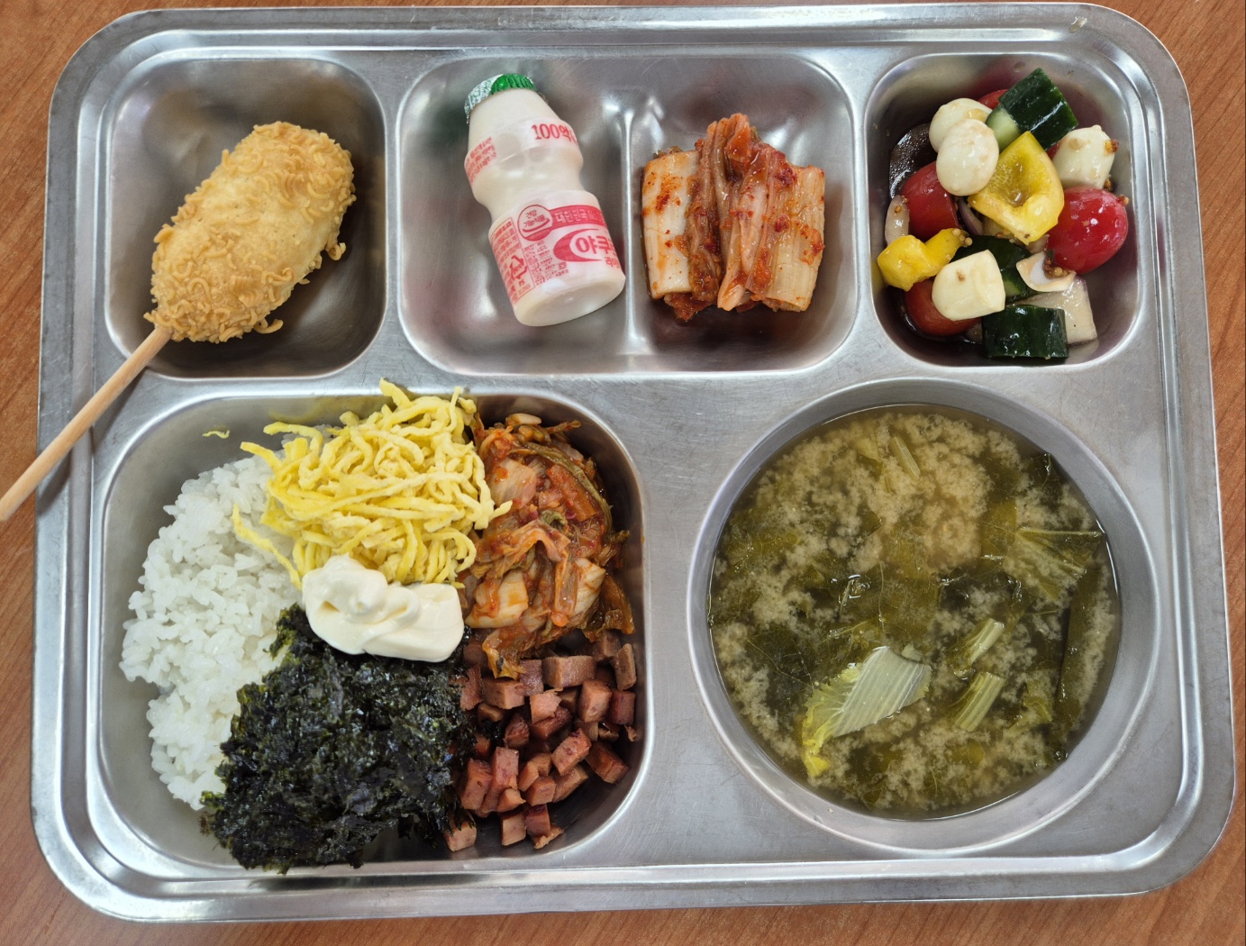 [중식] 스팸마요덮밥, 시락국, 라면땅치즈핫도그, 지중해식샐러드, 배추김치, 요구르트