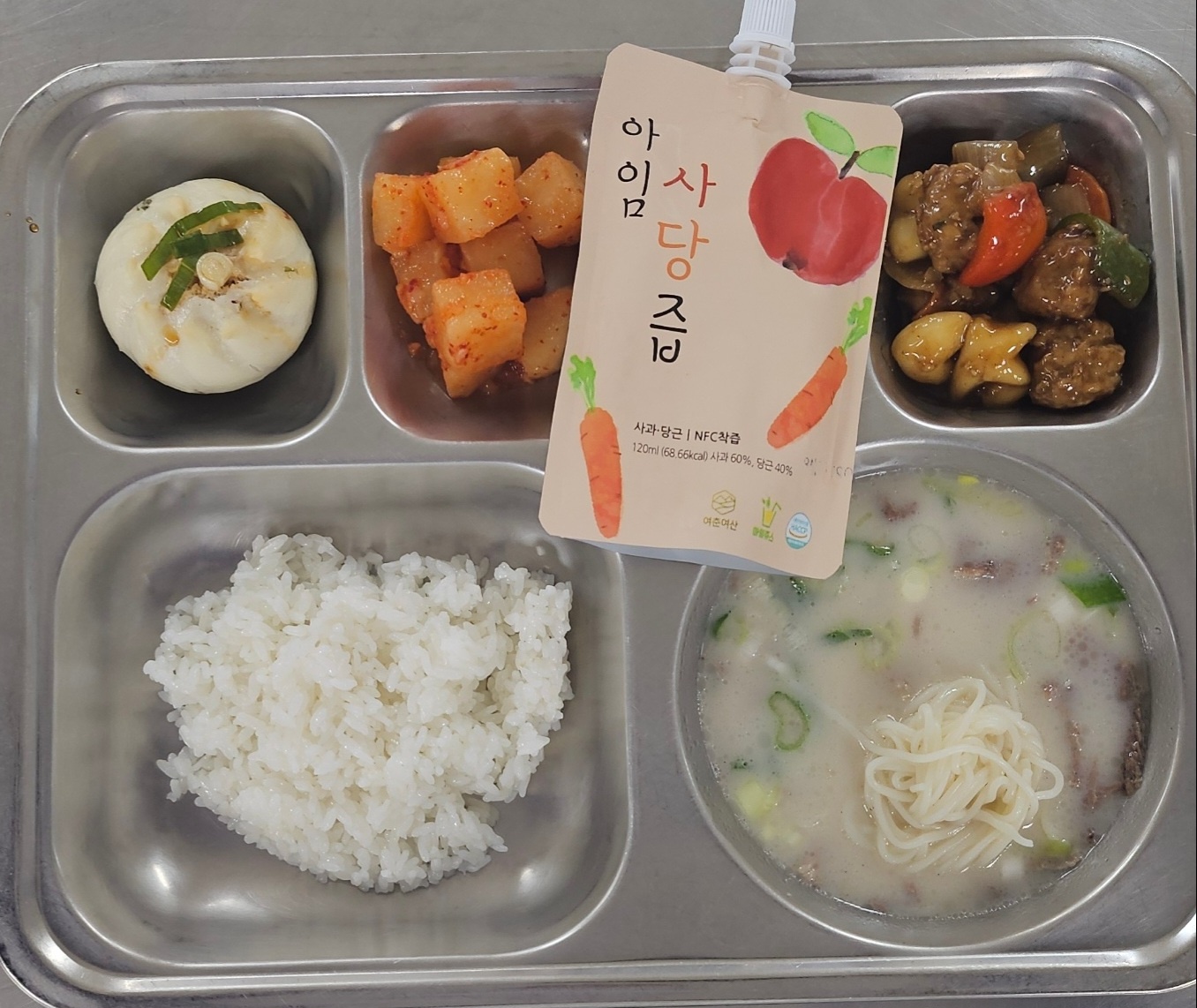 [조식] 친환경찹쌀밥, 우사골설렁탕, 데리야끼미트볼떡조림, 고추부추따바오, 깍두기, 사과당근주스