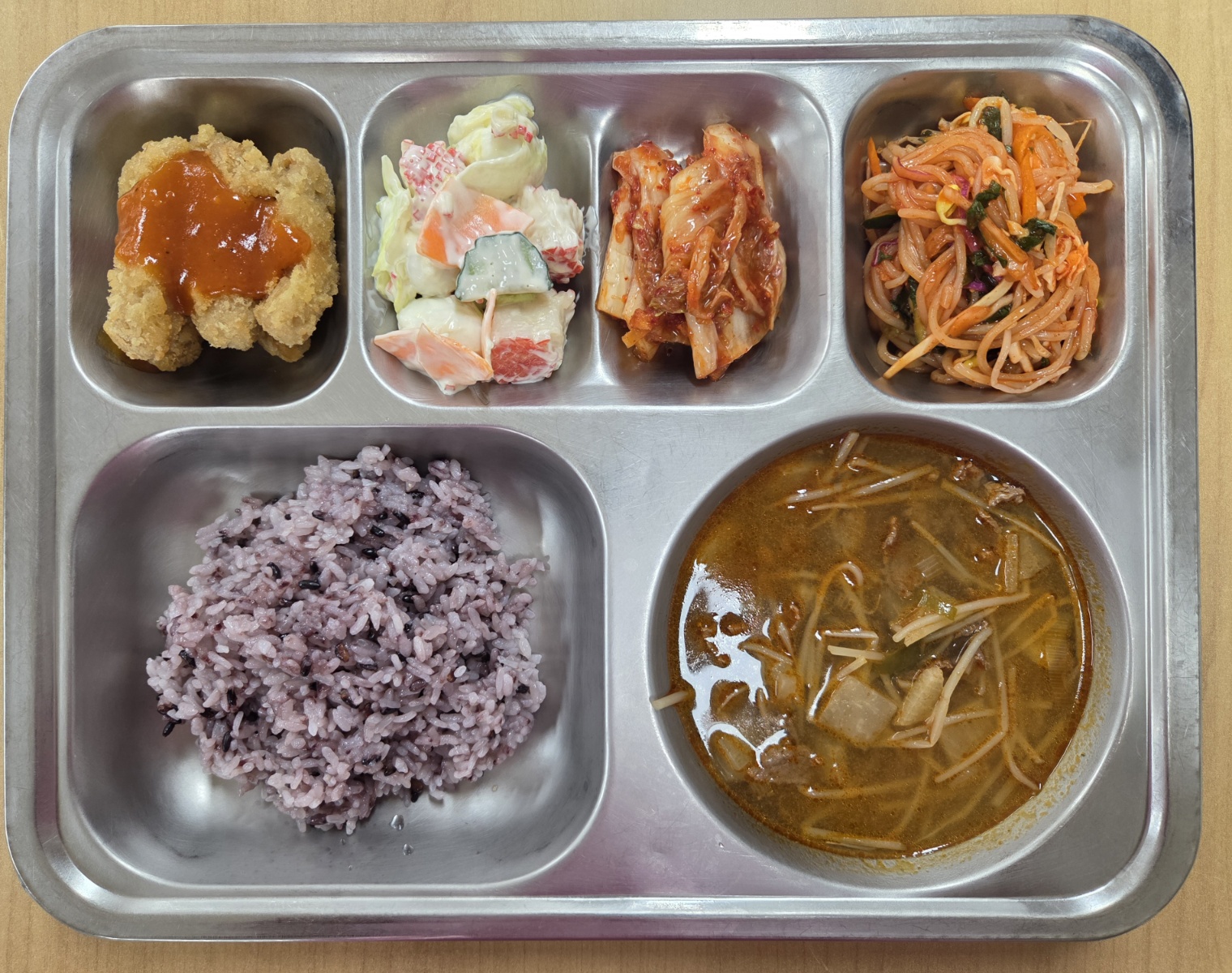 [석식] 찹쌀흑미밥, 쇠고기무국, 남해마늘스틱카츠, 쫄면야채무침, 꽃맛살샐러드, 배추김치