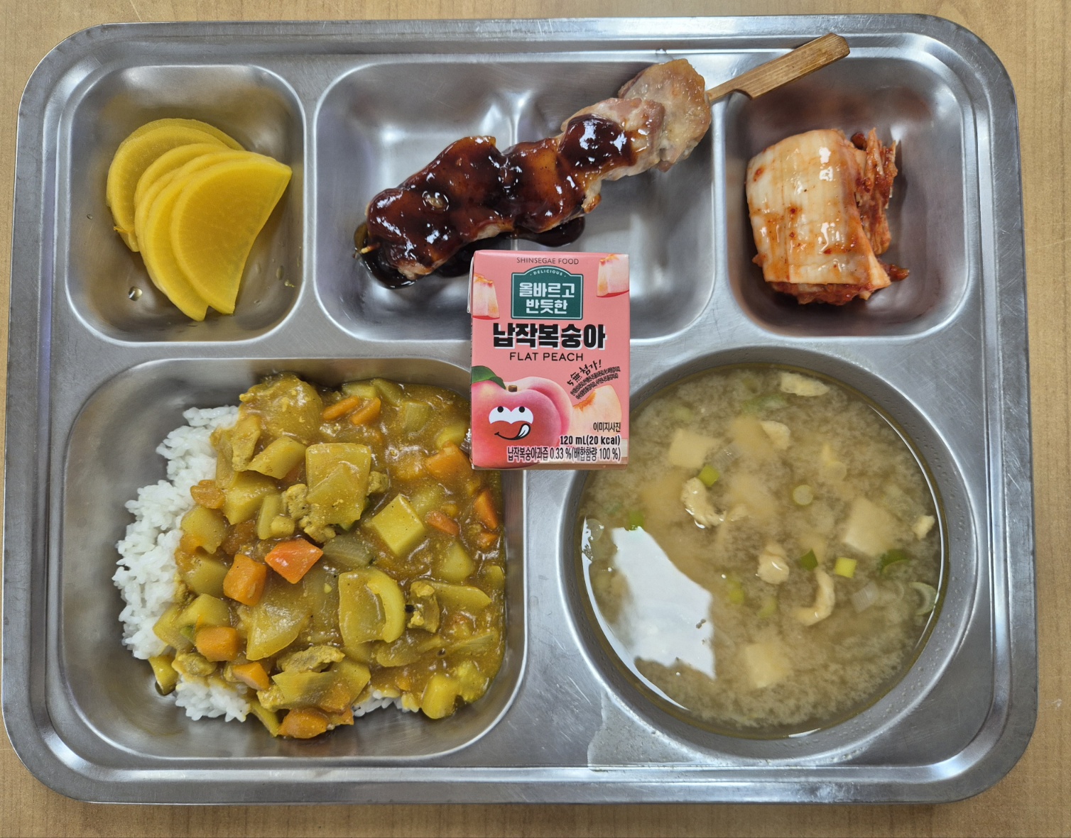 [석식] 단호박카레, 유부장국, 매콤닭꼬치, 단무지, 배추김치, 납작복숭아주스