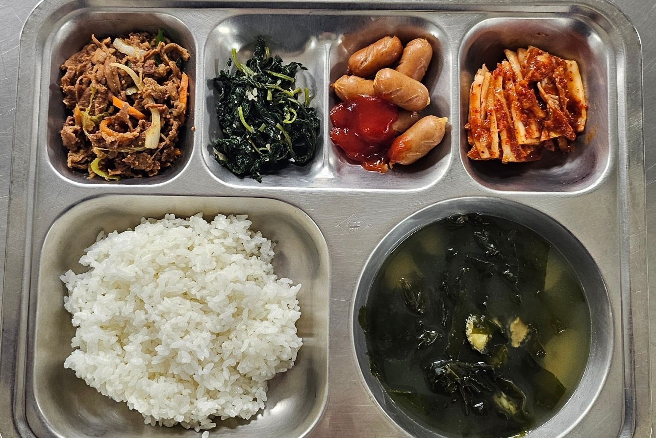 [조식] 친환경찹쌀밥, 꼬마전복미역국, 연탄직화간장불고기, 옛날분홍소세지전, 깨순나물(자율), 배추김치