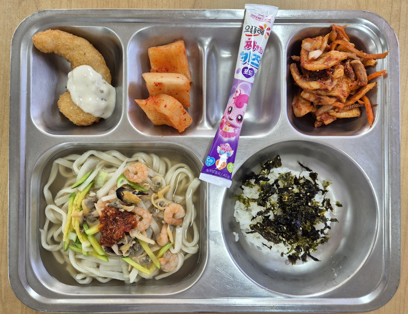 [중식] 미니밥*파래자반(자율), 바지락칼국수, 크리스피슈림프, 충무식오징어어묵무침, 섞박지, 짜먹는요거트