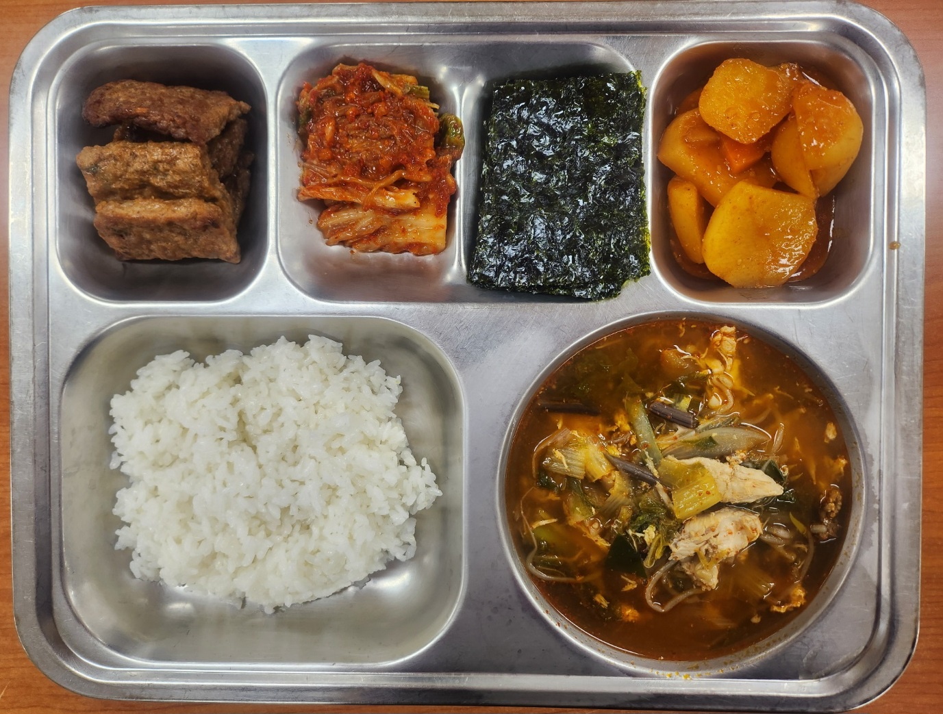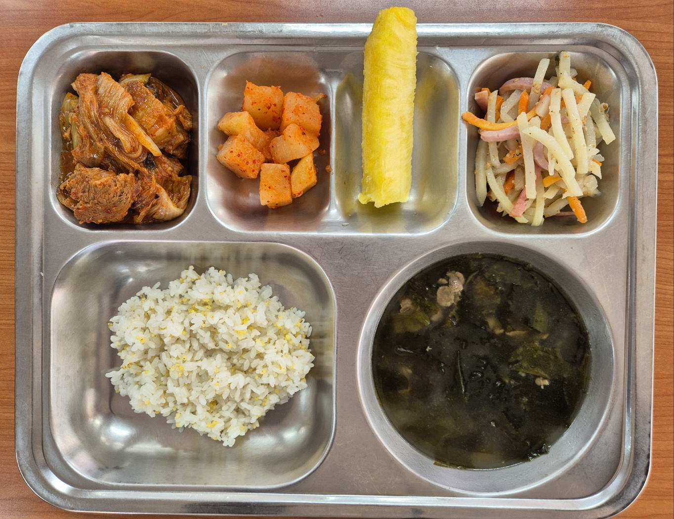 [중식] 기장밥, 쇠고기미역국, 돼지고기김치찜, 햄감자채볶음, 깍두기, 파인애플