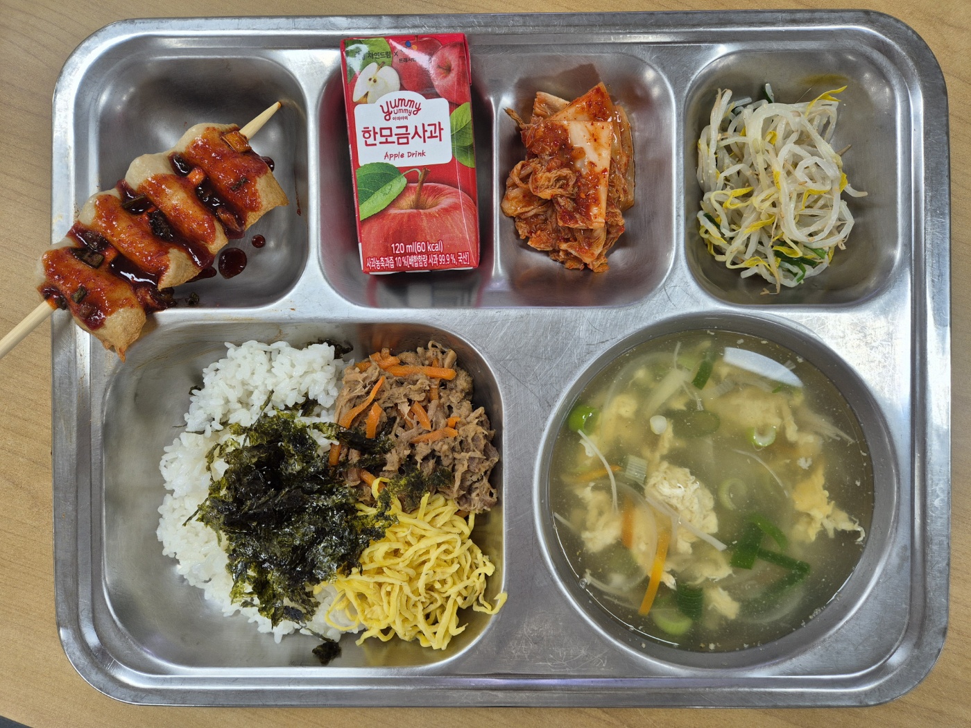 [석식] 버터장조림계란덮밥, 팽이버섯계란국, 매운꼬치어묵, 부추숙주나물무침, 사과한모금, 배추김치