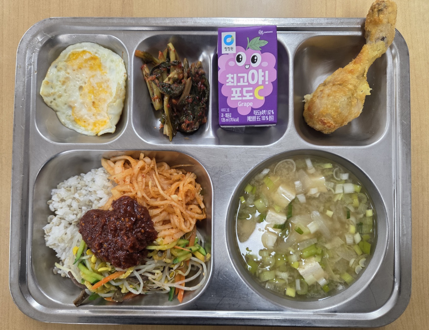 [석식] 나물비빔밥, 들깨무채국, 와사삭닭다리, 계란후라이, 열무김치, 포도쥬스