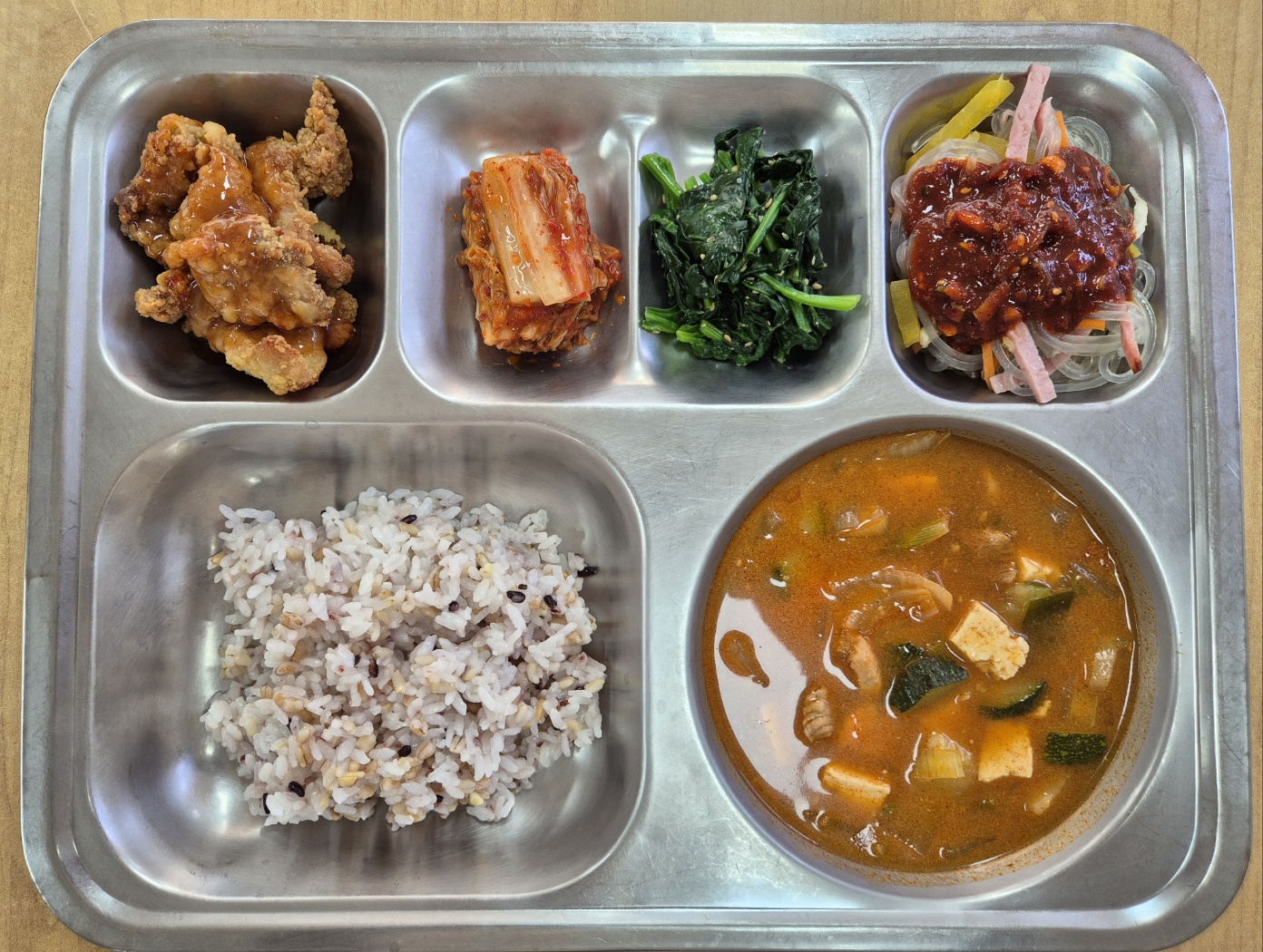 [중식] 친환경잡곡밥, 돈육고추장찌개, 돼지갈비후라이드, 비빔당면, 시금치나물, 배추김치