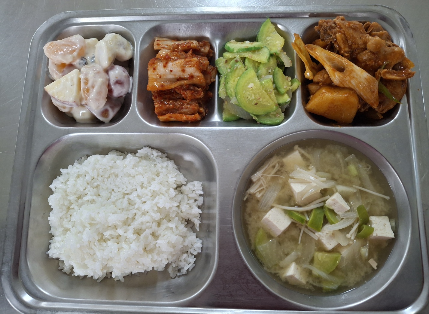 [조식] 친환경찹쌀밥, 팽이버섯된장국, 닭볶음탕, 애호박볶음(자율), 과일샐러드(귤), 배추김치