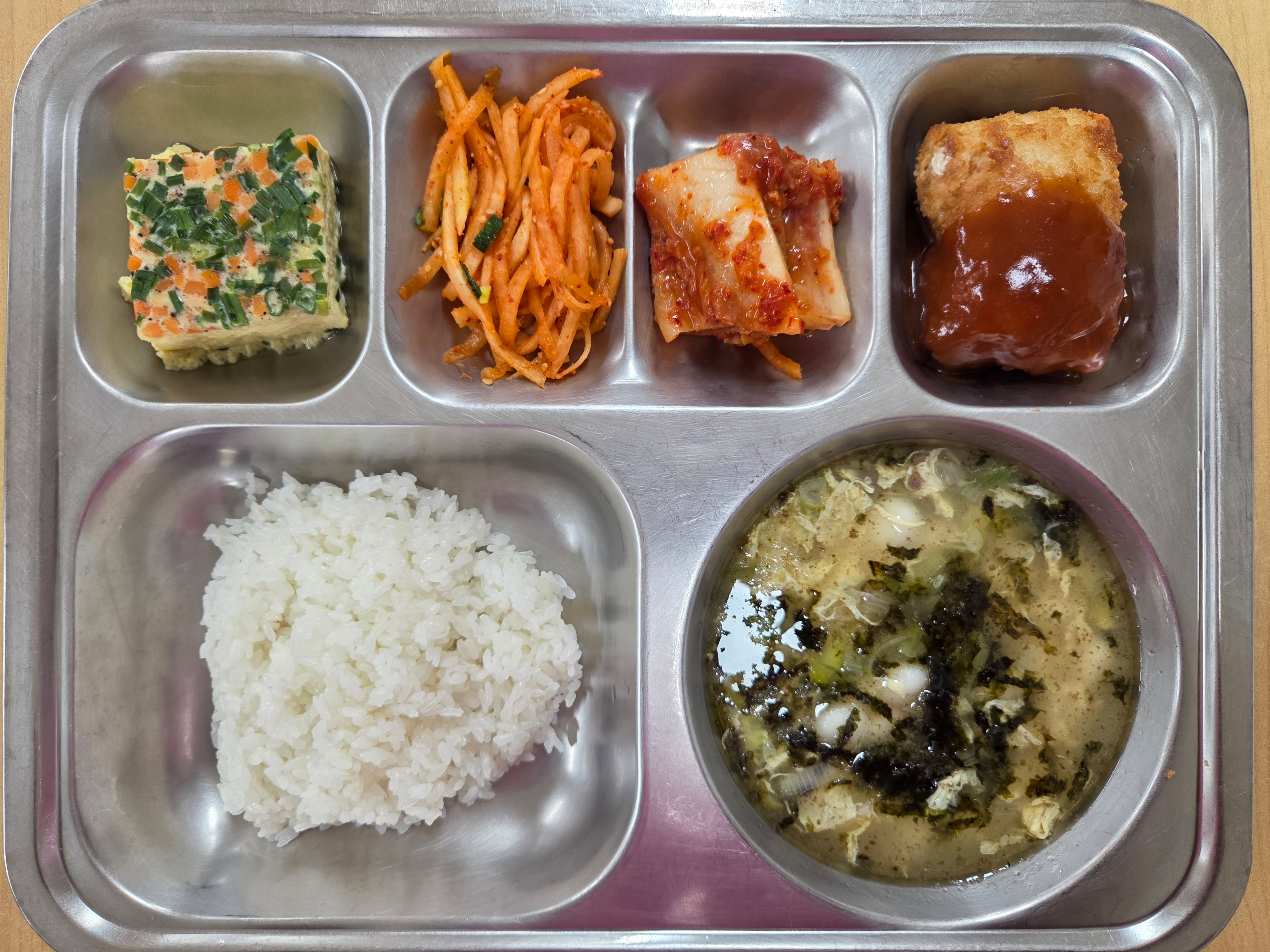 [석식] 친환경찹쌀밥, 조랭이떡국, 미니블럭치즈돈까스/소스, 계란찜, 잔파무생채, 배추김치