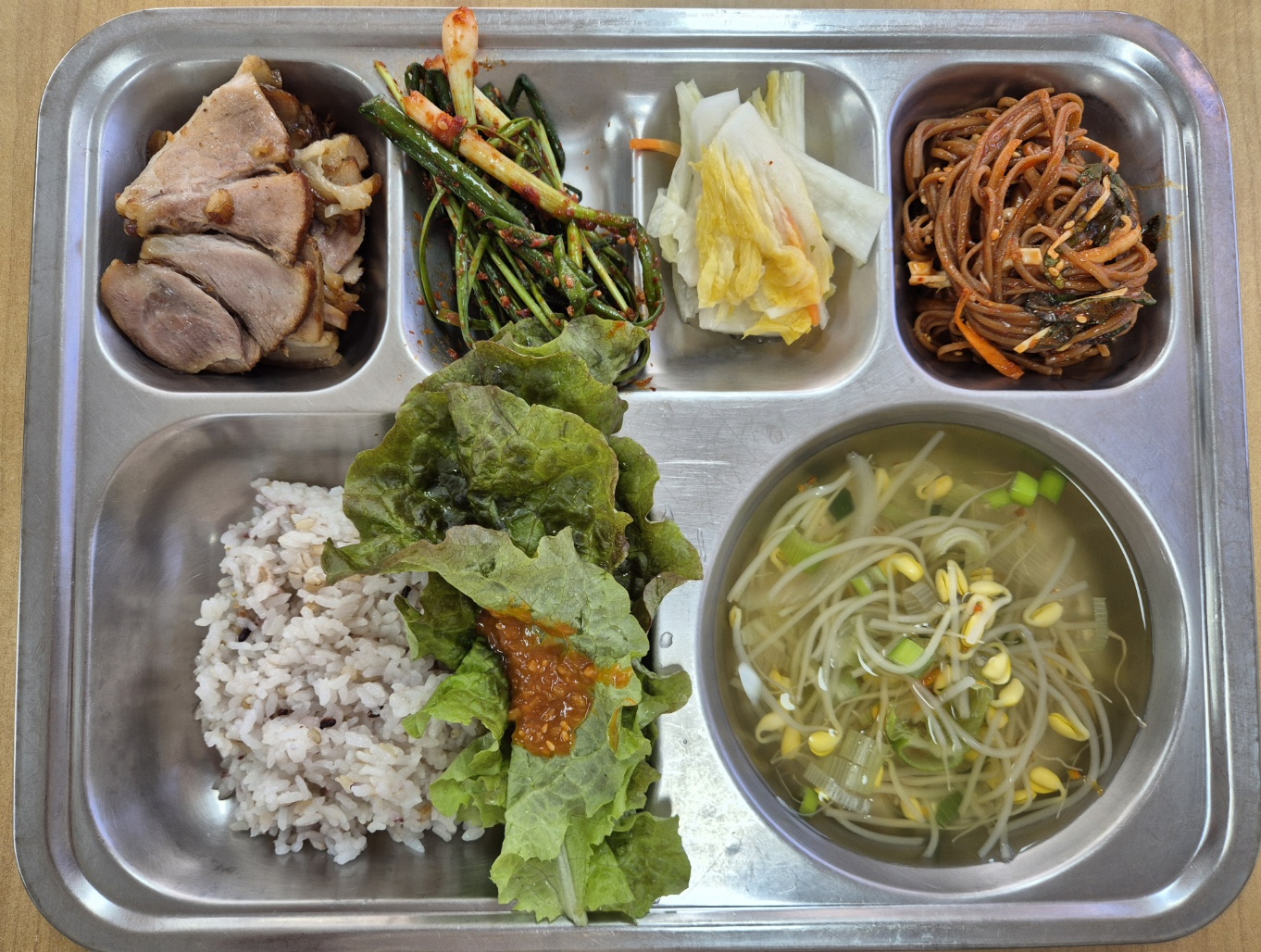 [중식] 친환경잡곡밥, 홍초콩나물국, 깐깐슈바인족발, 비빔막국수, 쪽파무침, 백김치, 상추쌈*쌈장(자율)