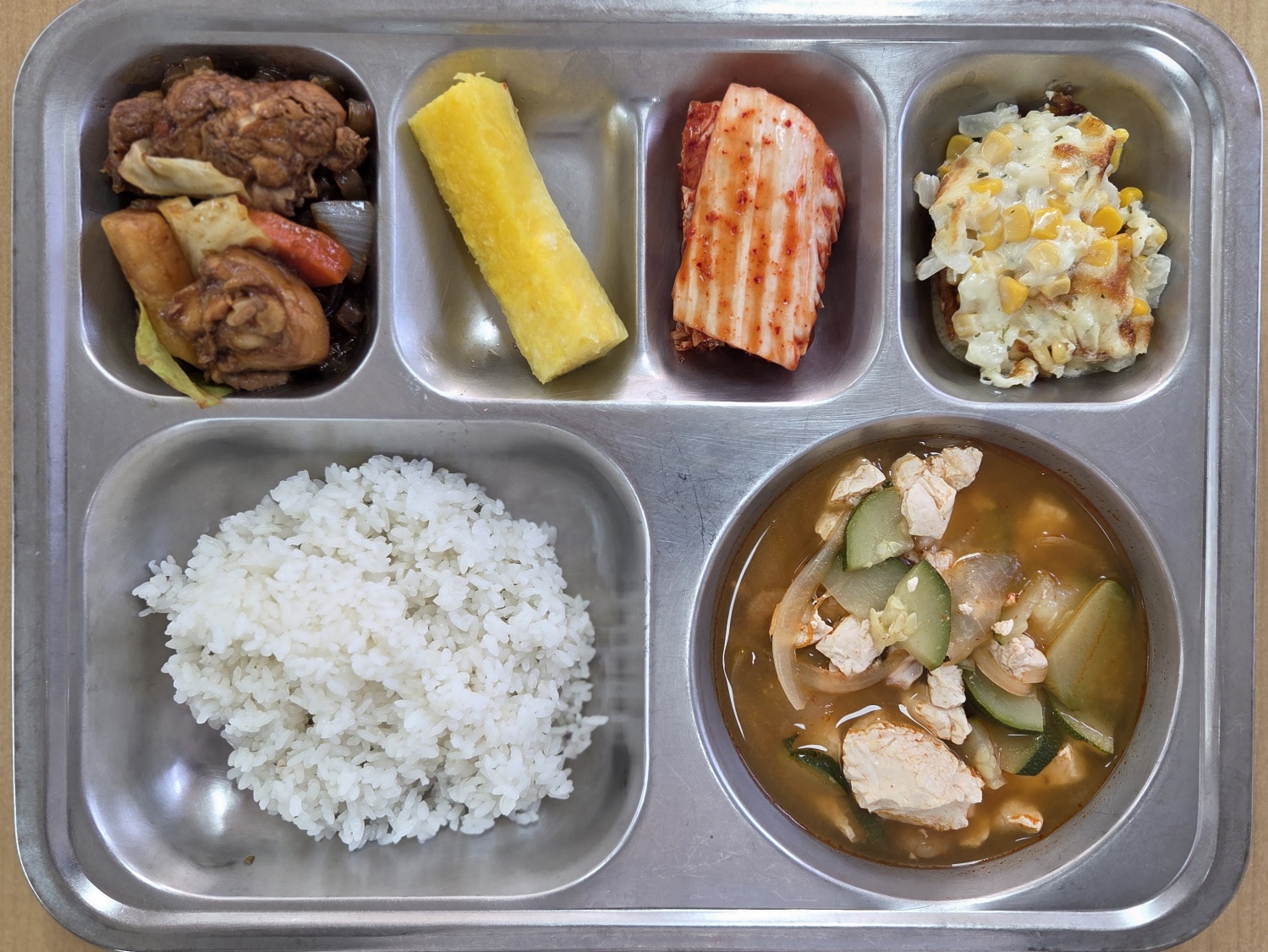 [중식] 친환경찹쌀밥, 해물순두부찌개, 봉추찜닭, 콘치즈오븐구이, 파인애플, 배추김치