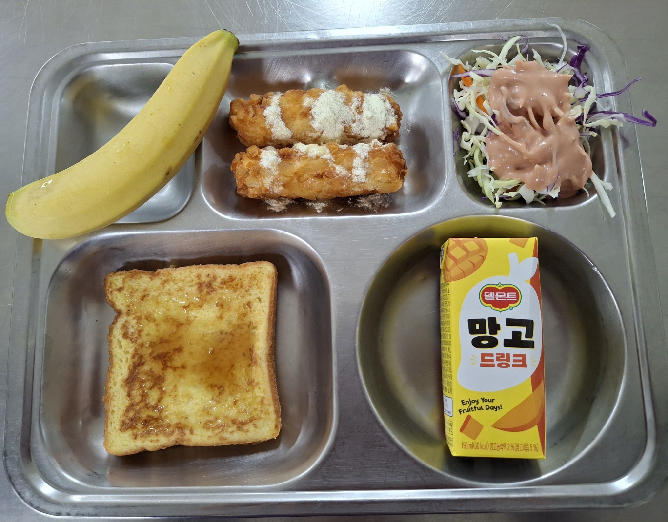 [조식] 프렌치토스트*메이플시럽, 양배추샐러드*사우전D, 감자치즈스틱, 바나나, 망고드링크