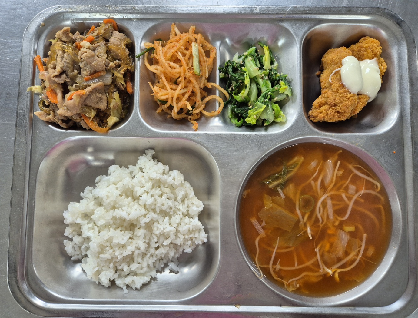 [석식] 친환경찹쌀밥, 김치콩나물국, 간장불고기, 치킨텐더*화이트소스, 잔파무생채, 단배추나물(자율)