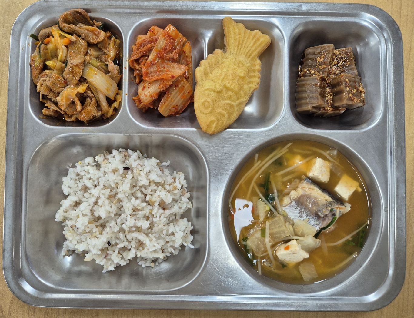 [석식] 친환경잡곡밥, 얼큰동태국, 오리고추장불고기, 도토리묵&양념장, 슈크림붕어빵, 볶음김치