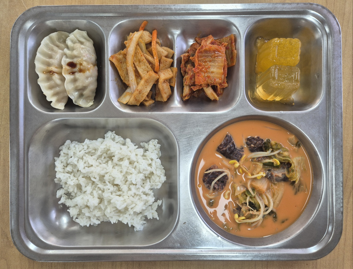 [중식] 친환경찹쌀밥, 얼큰우거지순대국밥, 새우&홍게살만두, 어묵볶음, 볶음김치, 사과&한라봉푸딩
