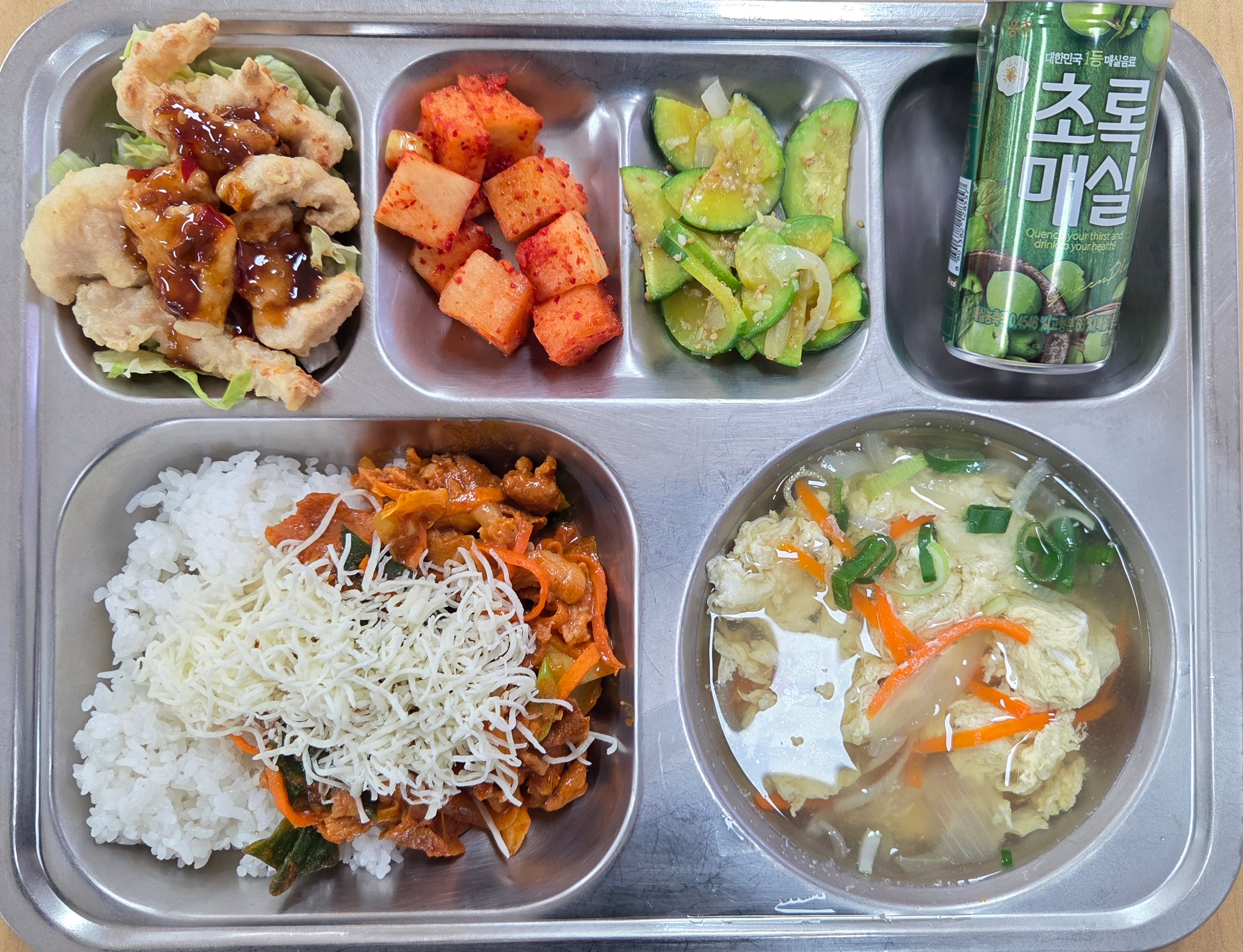 [석식 눈꽃치즈제육덮밥, 파송송계란국, 통닭가슴살유린기, 애호박볶음(자율), 초록매실, 깍두기