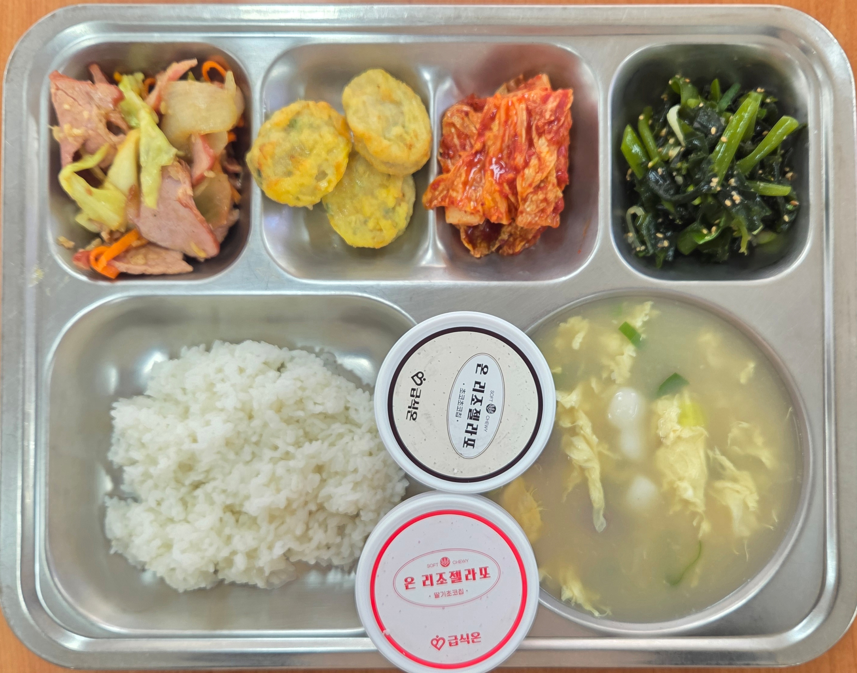 [중식] 친환경찹쌀밥, 조랭이떡국 연잎돼지순살야채볶음, 동그랑땡전, 물미역나물, 초코젤라또, 배추김치