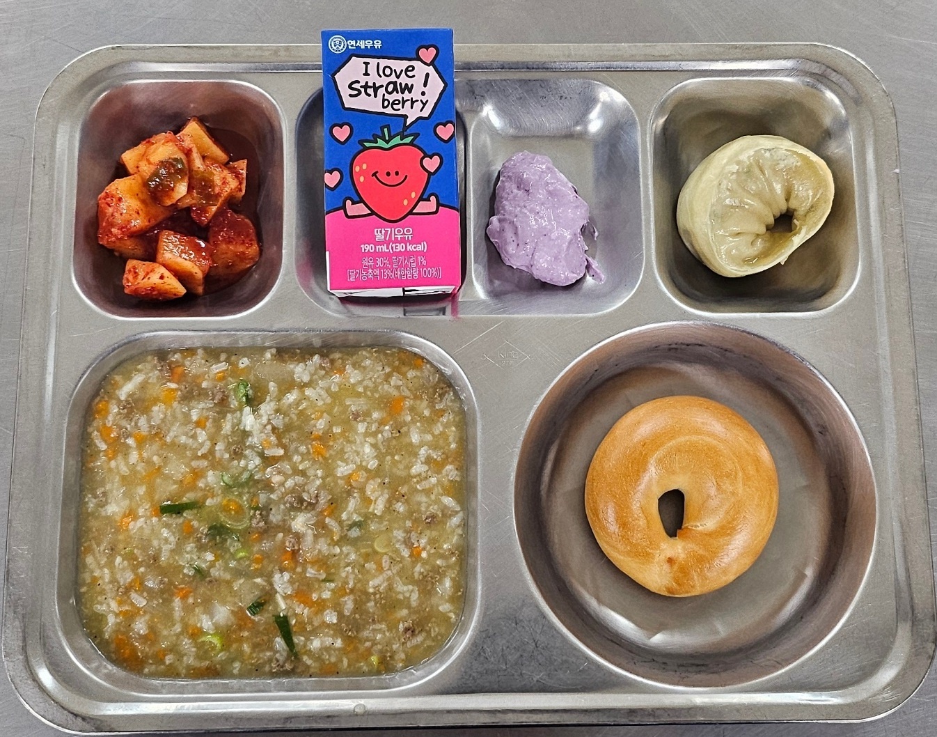 [조식] 쇠고기야채죽, 이북식손만두, 베이글*크림치즈, 딸기우유, 깍두기