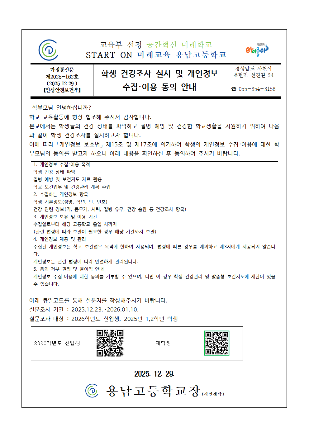 [2025-162호] 2026학년도 학생 건강조사 실시 및 개인정보 수집 이용동의 안내
