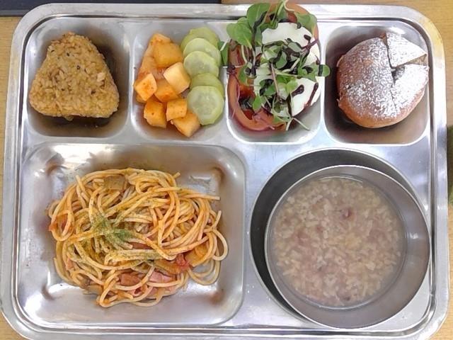 구운주먹밥(소불고기)(1.2.5.6.10.15.16)숭늉/ 김치수제오이피클(13)토마토소스스파게티(1.2.5.6.10.12.13.16)크림마늘빵(2.5.6)카프리제(2.12.13)* 에너지/단백질/칼슘/철798.8/23.0/172.2/4.6