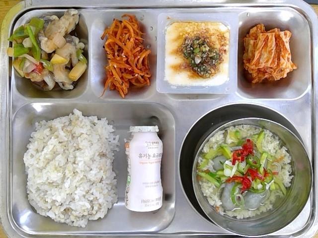 보리밥 옹심이 만두국 (1.5.6.10.16.18)연두부+양념장 (5.6)도라지진미채무침 (5.6.13.17)손탕수육(고기+표고) (5.6.10.12.13)유기농요구르트 (2)