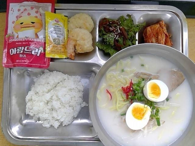 미니7분도미밥돈코츠라멘(1.2.5.6.10.15.16)꼬들무치커리무침(13)왕새우튀김(1.2.5.6.9.13)리얼딸기쥬스(13)* 에너지/단백질/칼슘/철758.5/18.8/244.3/2.9