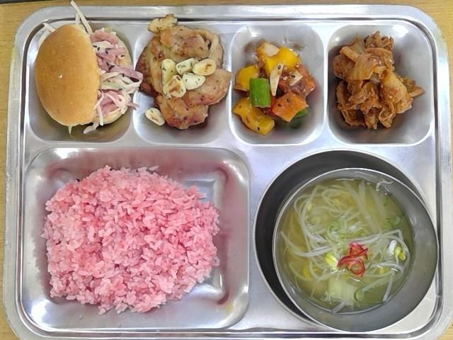 홍국밥콩나물무채국(5)파프리카된장무침(5.6)닭살마늘구이(15)케요네즈샐러드빵(1.2.5.6.10.12.13.15.16)* 에너지/단백질/칼슘/철739.0/33.9/304.2/2.7