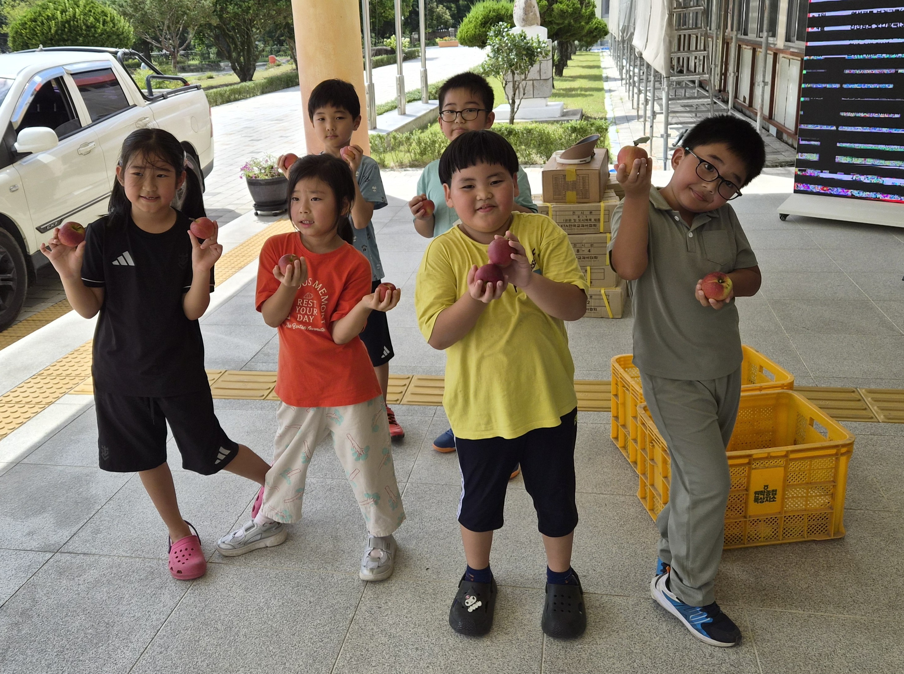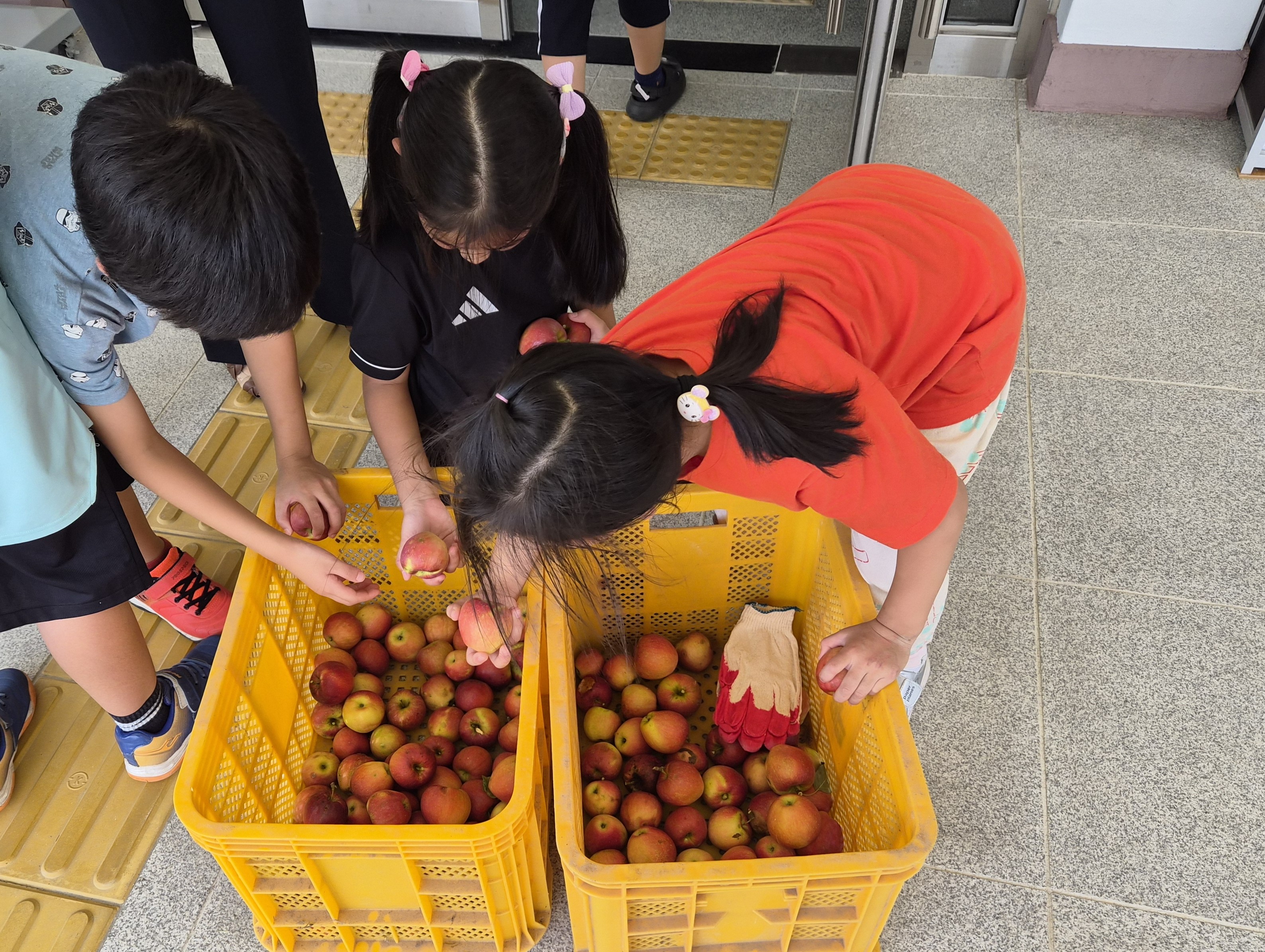 2그루의 사과나무에서 빨갛게 익은 사과를 따서 전교생에게 2개씩 나누어 주었습니다.