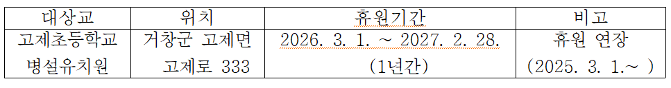 2026학년도 고제초등학교병설유치원 휴원(연장) 행정예고 1. 공고 사유(취지) 2026학년도 원아 모집 결과 지원 원아가 없어 정상적인 유치원 교육이 어려운 바, 「유아교육법」 제31조에 따라 아래와 같이 1년간 “휴원” 조치하고자 함 2. 주요 내용