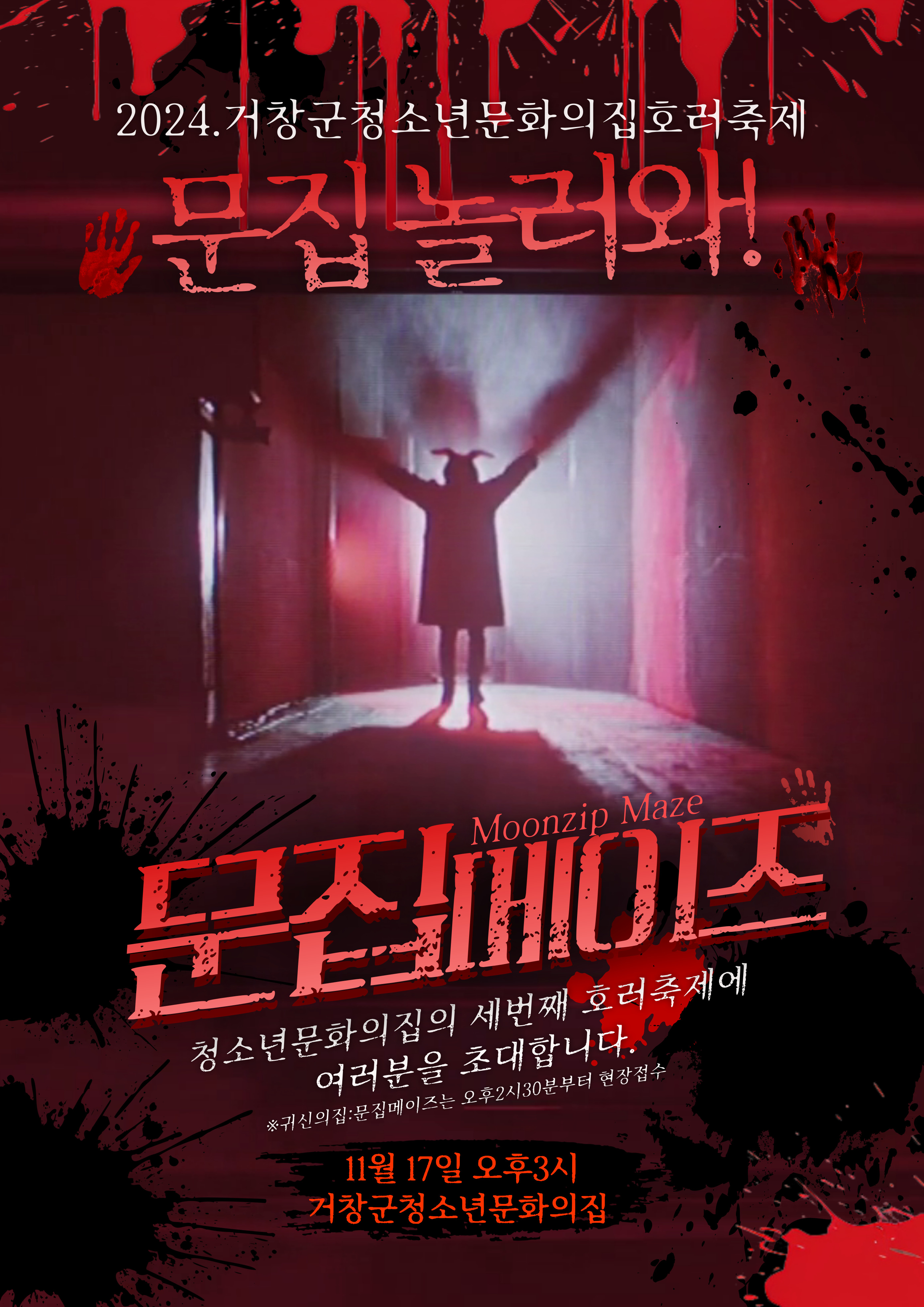 거창군 청소년문화의집을 지역사회에 홍보하고 `청소년 문화 전용공간'에 대한 의식 고취를 위한 '문집 놀러와' 행사를 다음과 같이 운영하오니 관심있는 학생들은 많은 참여바랍니다. 1. 사업명: 문집 놀러와! 2. 운영기간: 2024. 11. 17.(일) 15:00~19:00 - 호러코스튬 접수기간: 2024. 11. 5. (화) 09:00 ~ /선착순 마감 - 접수방법: 거창군청소년문화의집 홈페이지 접수 /http://www.geochang.go.kr/gcyouth 3. 문의처: 거창군청소년문화의 집 (055-940-8830~3)