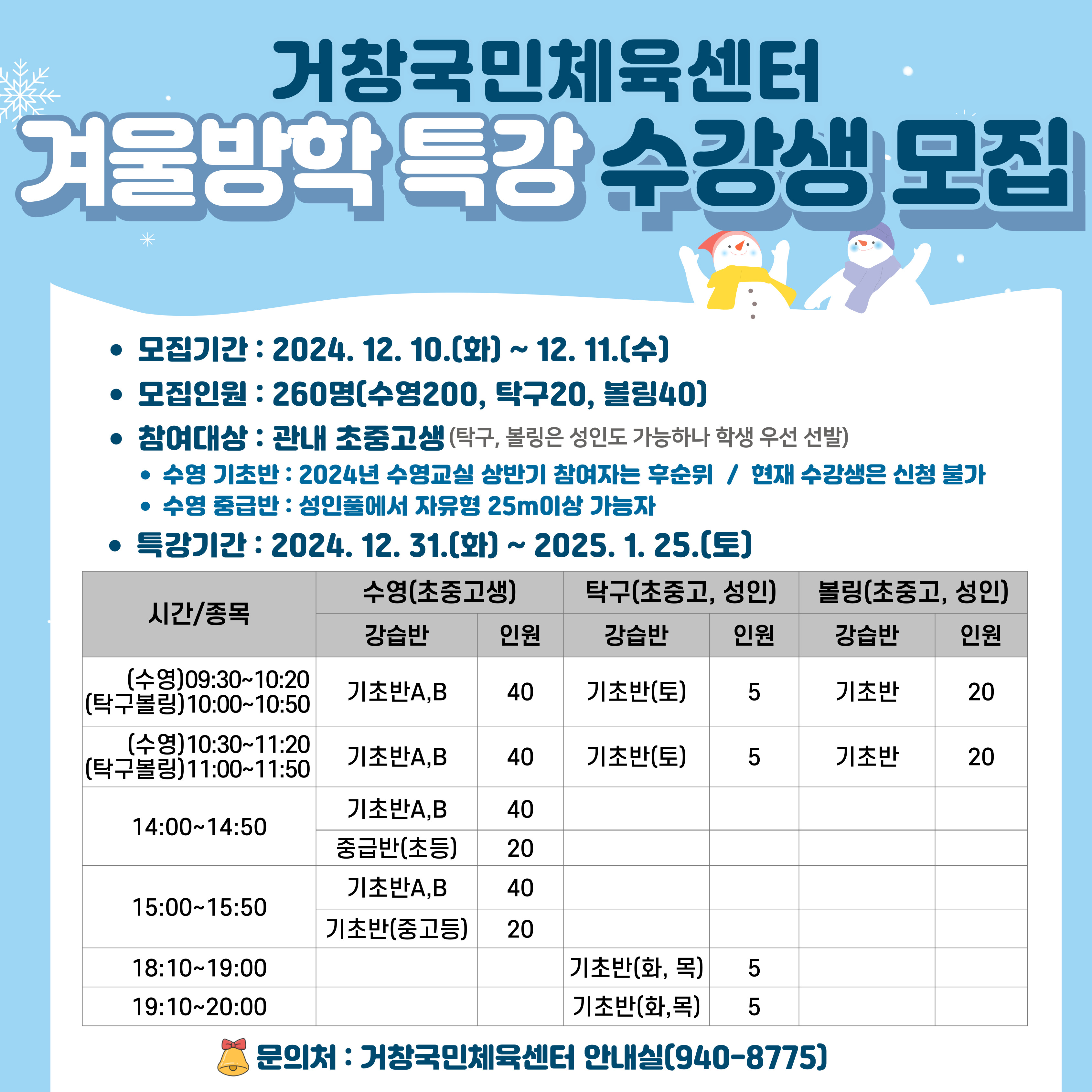 거창국민체육센터 겨울방학 특강 수강생 모집