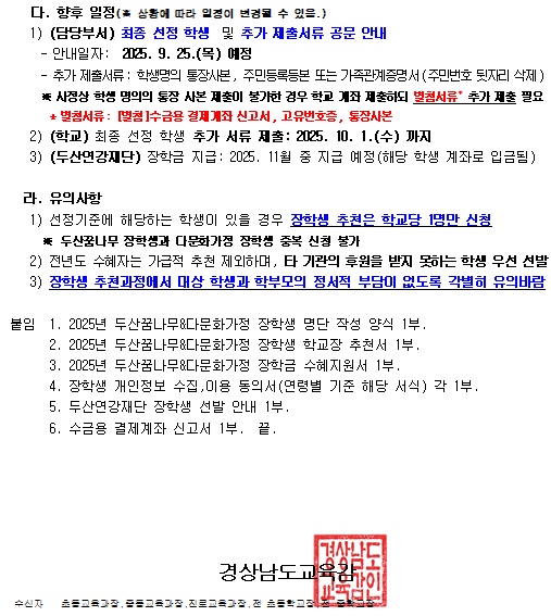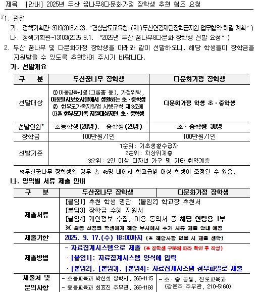 경남교육청-두산장학재단과 2025년 장학금을 지급합니다.