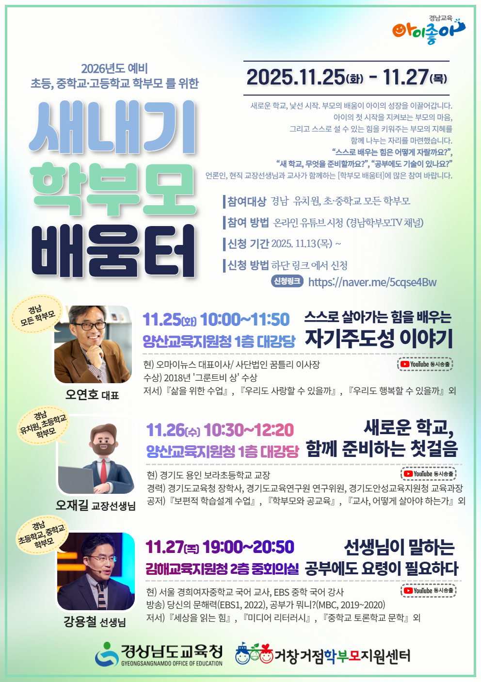 1. 대상 ① 관내 초등학교 취학 및 중·고등학교 진학 예정인 학부모 ② 학교 교육과정에 관심 있는 학생 및 학부모 600여명(대면 150명, 비대면 450명 이상) 2. 기간: 2025년 11월 25일(화)~ 27일(목), 총 3회 3. 신청 기간: 2025년 11월 13일(목) 오전 9시~ 4. 신청 방법: 온라인 URL-주소를 통한 접수 ☞ https://naver.me/5cqse4Bw