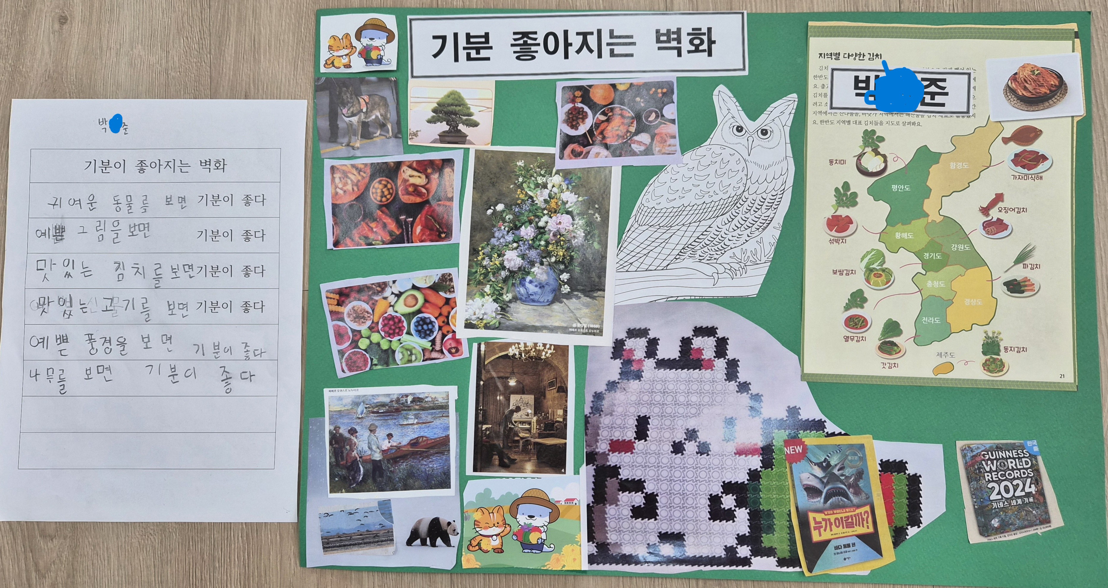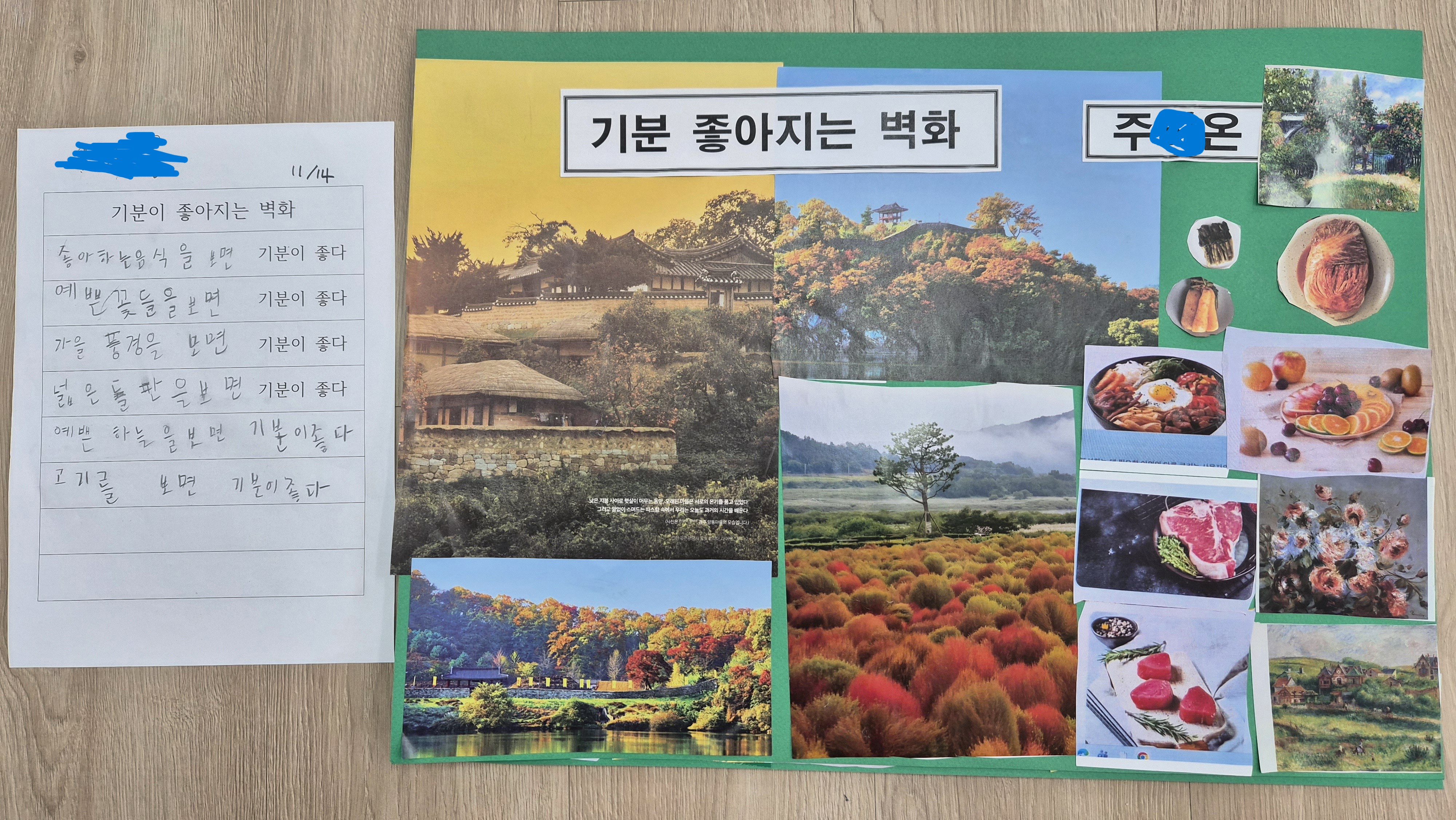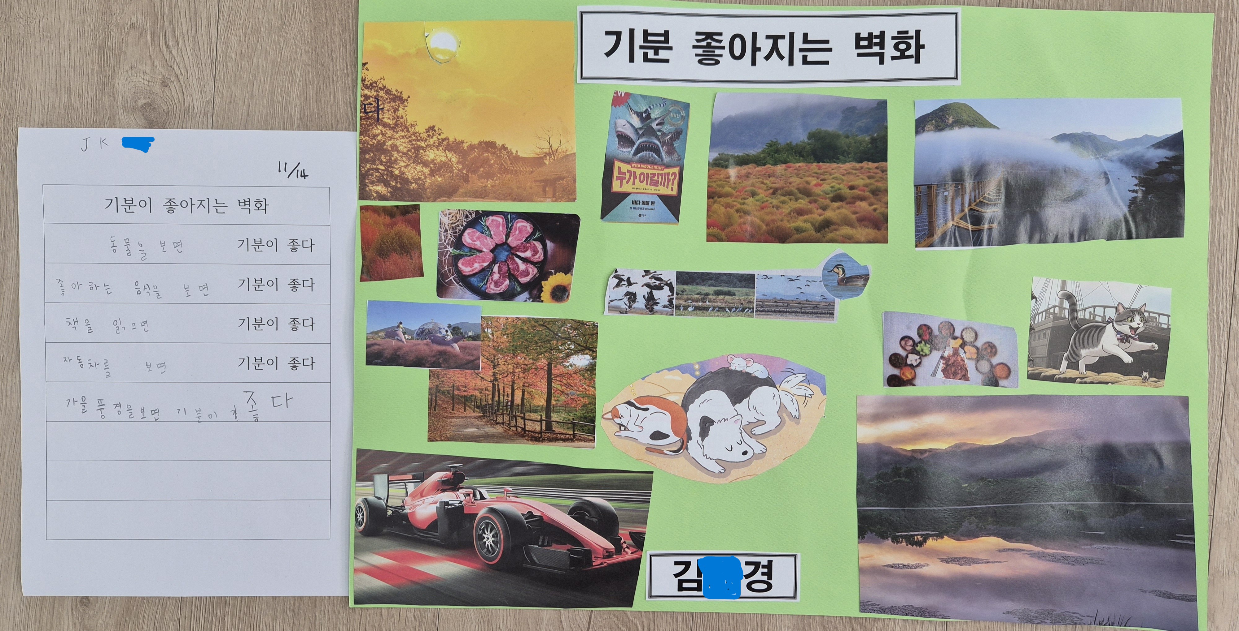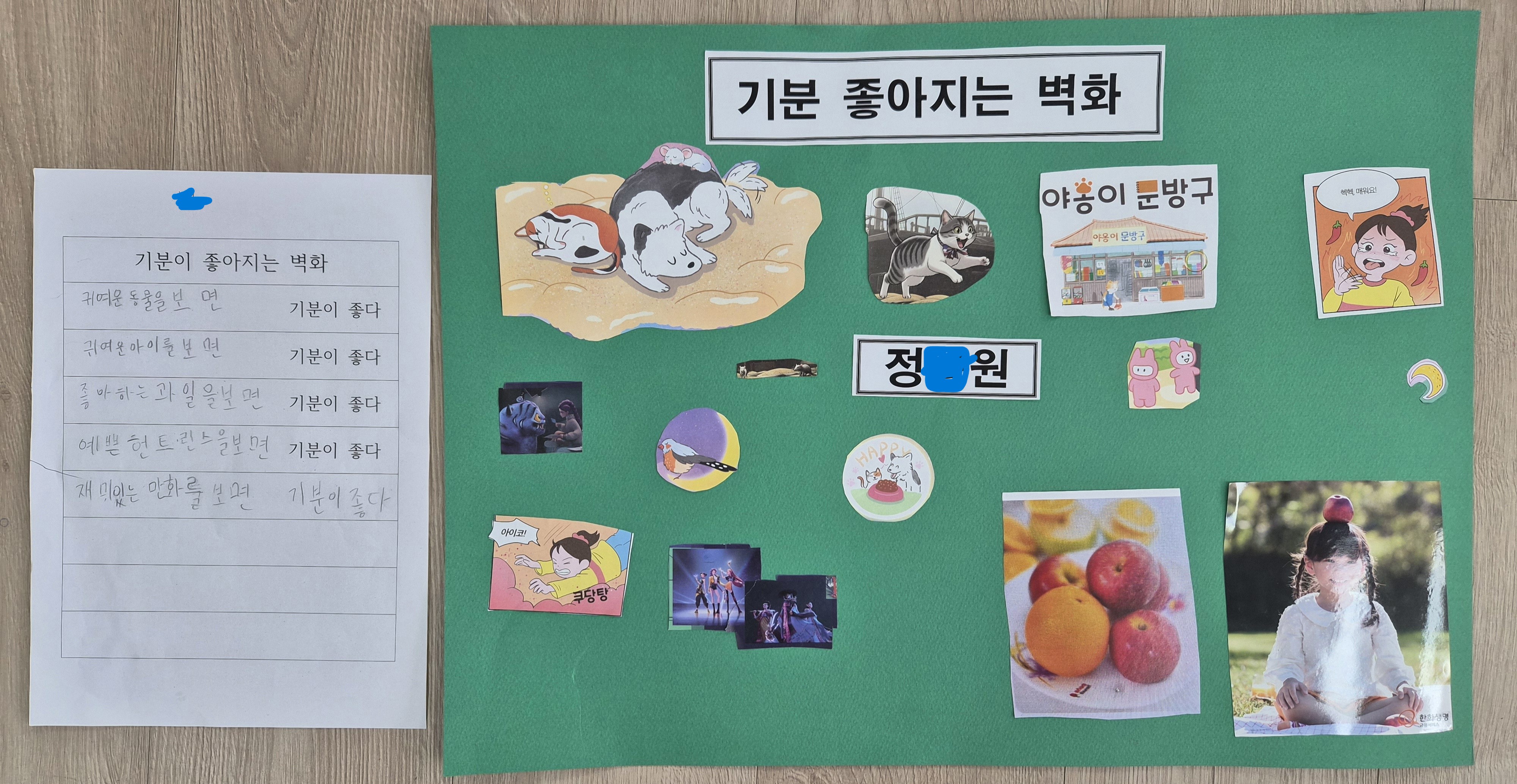 자신이 힘들거나 스트레스 상황에 처했을 때 기분이 좋아지는 것들로 채운 벽화를 보면서 심리적인 안정을 느껴보는 수업이었습니다.