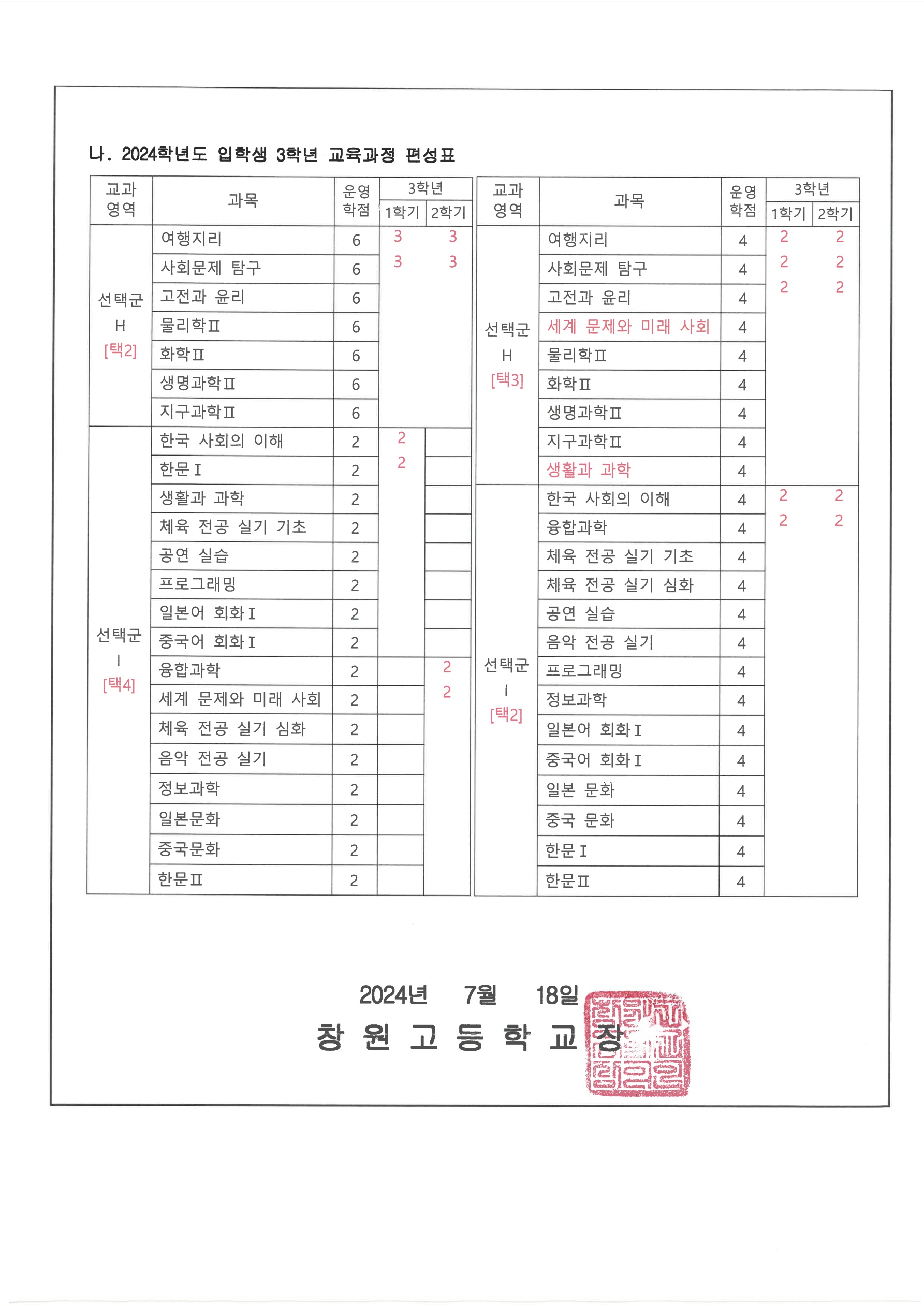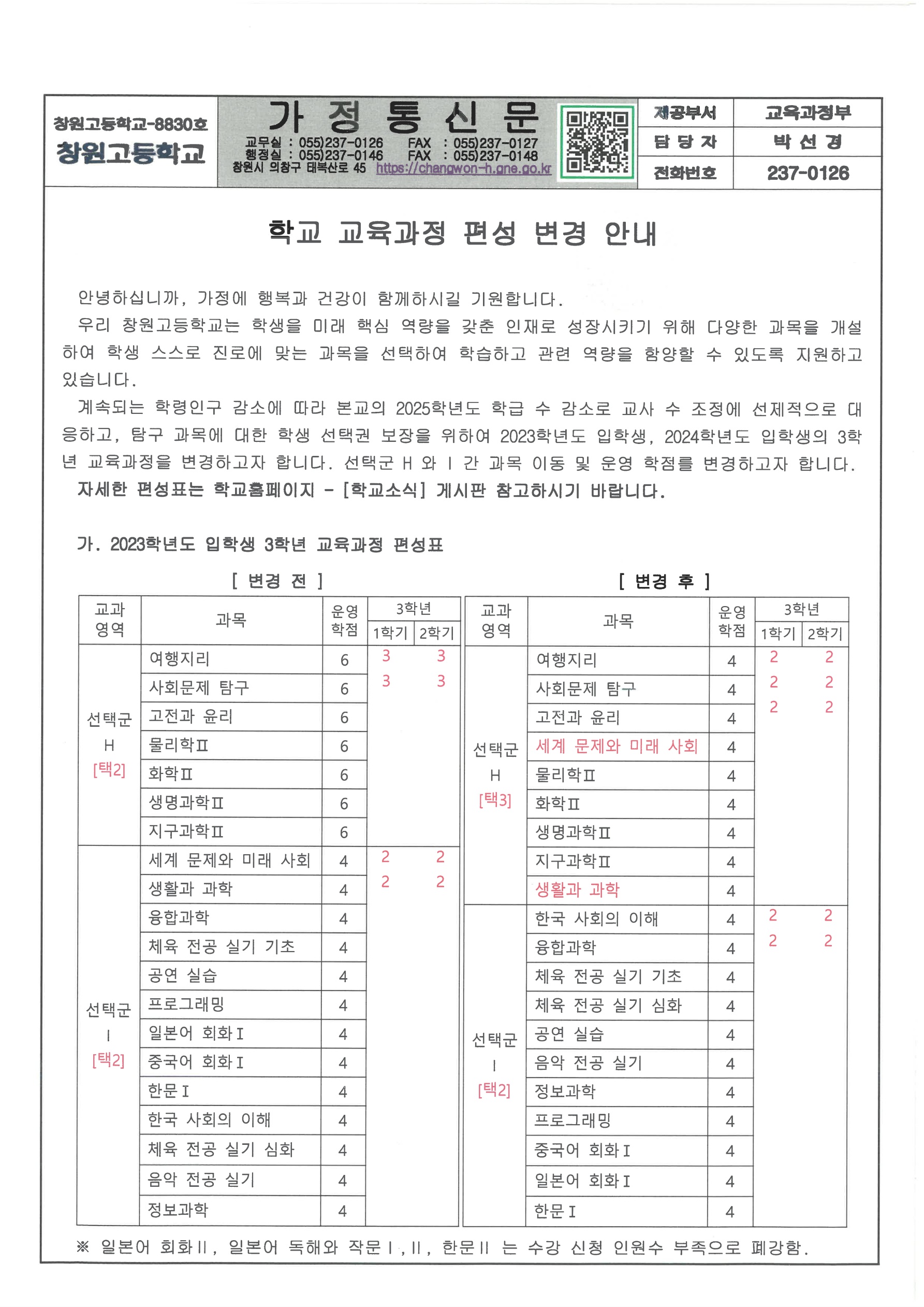 2023학년도 입학생, 2024학년도 입학생 3학년 교육과정 편성 변경 가정통신문