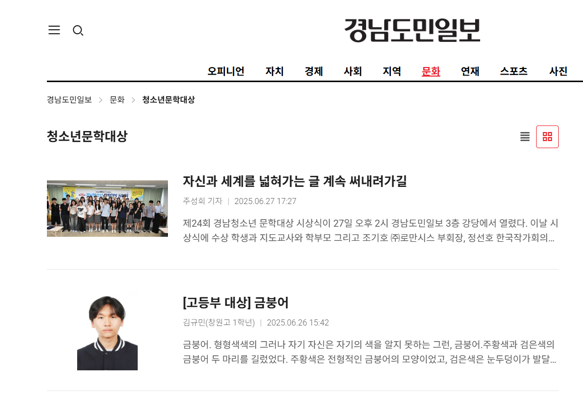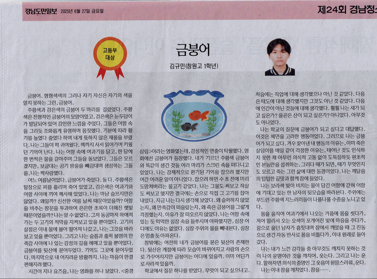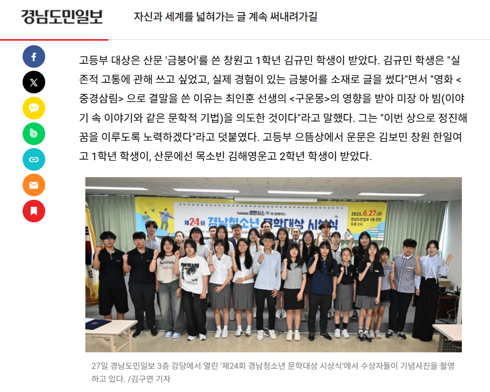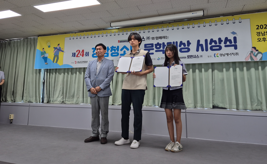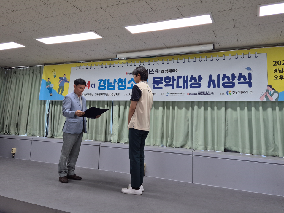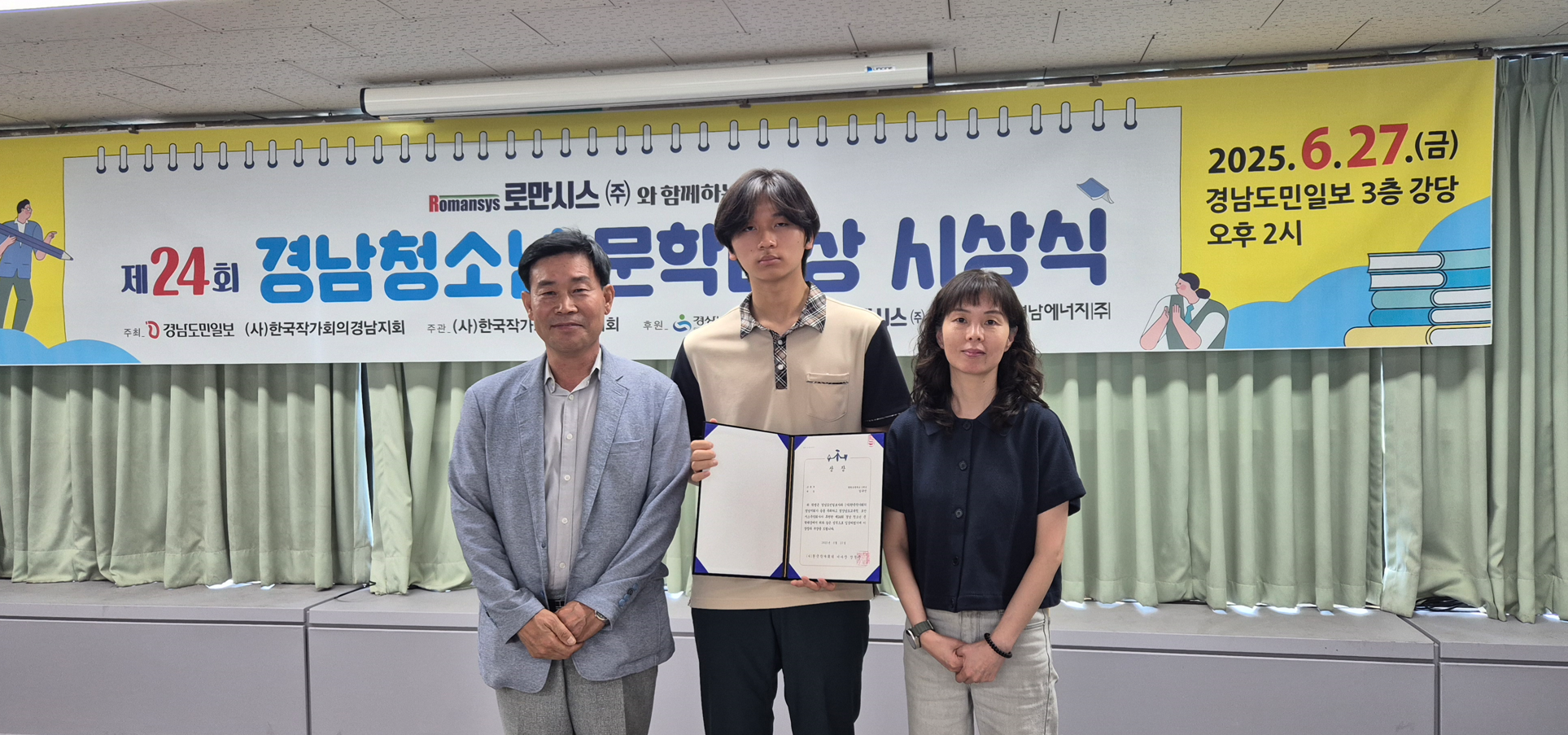 경상남도교육청이 후원한 「제24회 경남청소년문학대상」 에서 '대상'을 수상하였습니다.