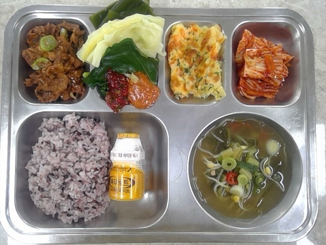 검정쌀밥 근대콩나물된장국 (5.6)돼지고기간장바싹불고기 (5.6.10.13.18)감자치즈그라탕 (1.2.5.6.13)배추김치 (9)당줄인야쿠르트500 (2)모듬익힌쌈(양배추,케일,다시마) (5.6.13)