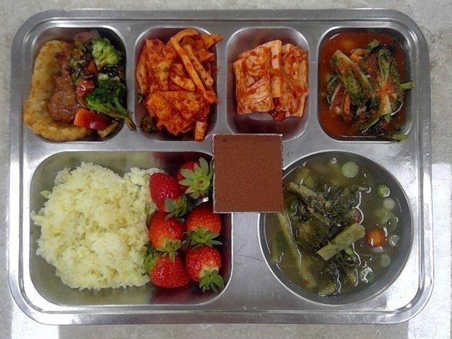 강황쌀밥 무청시락국 (5.6.18)통영식오징어무침 (1.5.6.13.17)치킨닭다리살해쉬브라운 (1.2.5.6.12.13.15.16)배추김치 (9)직접만든열무얼갈이물김치 (6)딸기 티라미수케이크 (1.2.5.6)