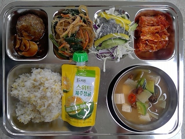기장밥 미더덕된장찌개 (5.6)양배추적채샐러드+흑임자소스 (1.5.13)한식잡채 (1.5.6.10.13)불맛스테이크한판 (1.2.5.6.10.12.13.15.16)배추김치 (9)스위트제주청귤