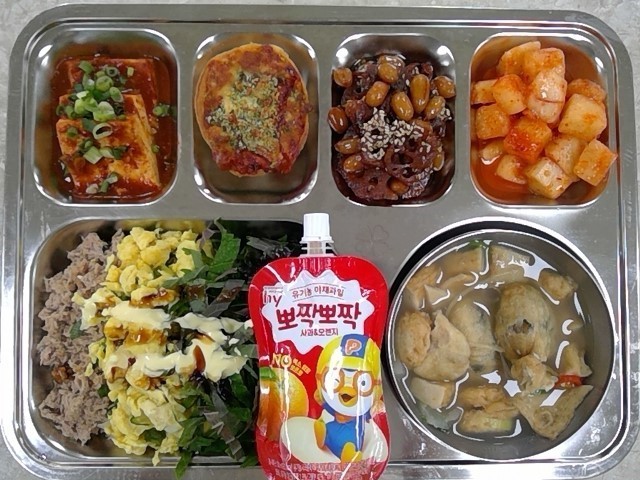 참치마요덮밥 (1.5.6.13)유부보쌈어묵국 (1.5.6.10.16)연근땅콩조림 (4.5.6.13)두부구이양념조림 (5.6)깍두기 (9)수제미니피자 (1.2.5.6.10.12)오렌지자몽주스 (13)