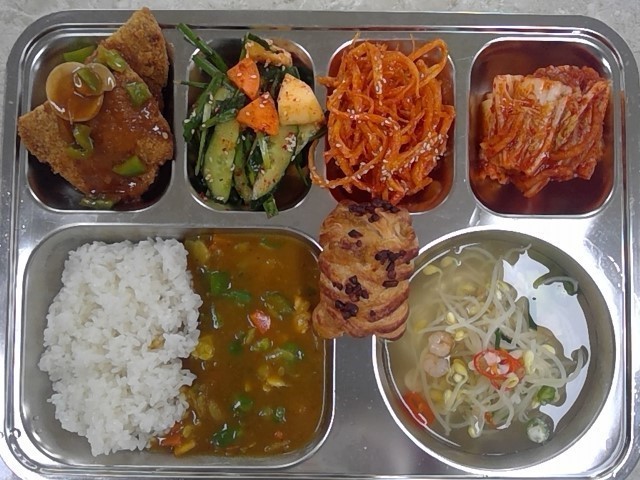 인델리카레라이스 (2.5.6.10.12.13.15.16.18)맑은콩나물국 (5.9.13)오이사과무침 (13)일미포볶음 (1.5.6.13.17)우리밀치즈반달돈가스+소스 (1.2.5.6.10.12.13.18)배추김치 (9)미니메이플피칸파이 (1.2.5.6.14)