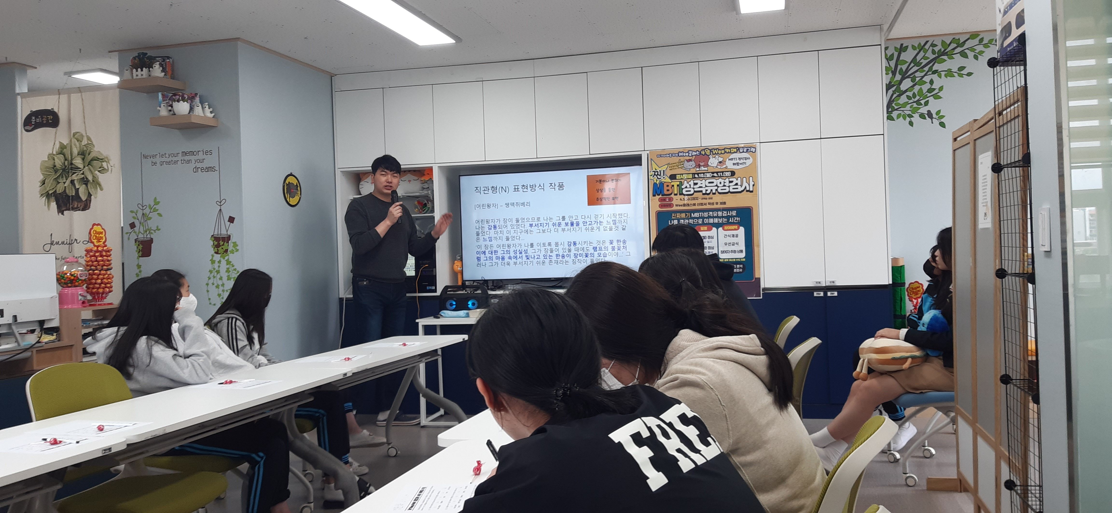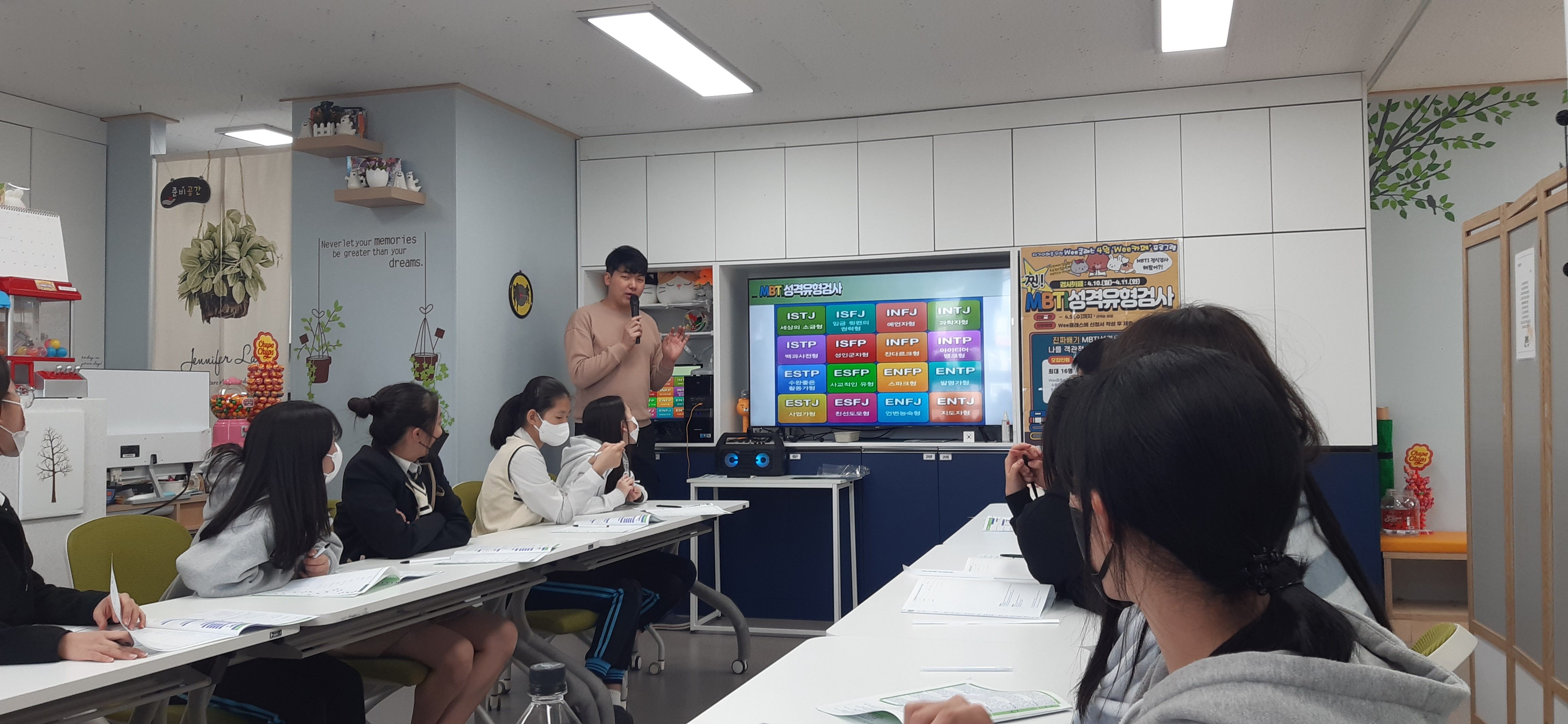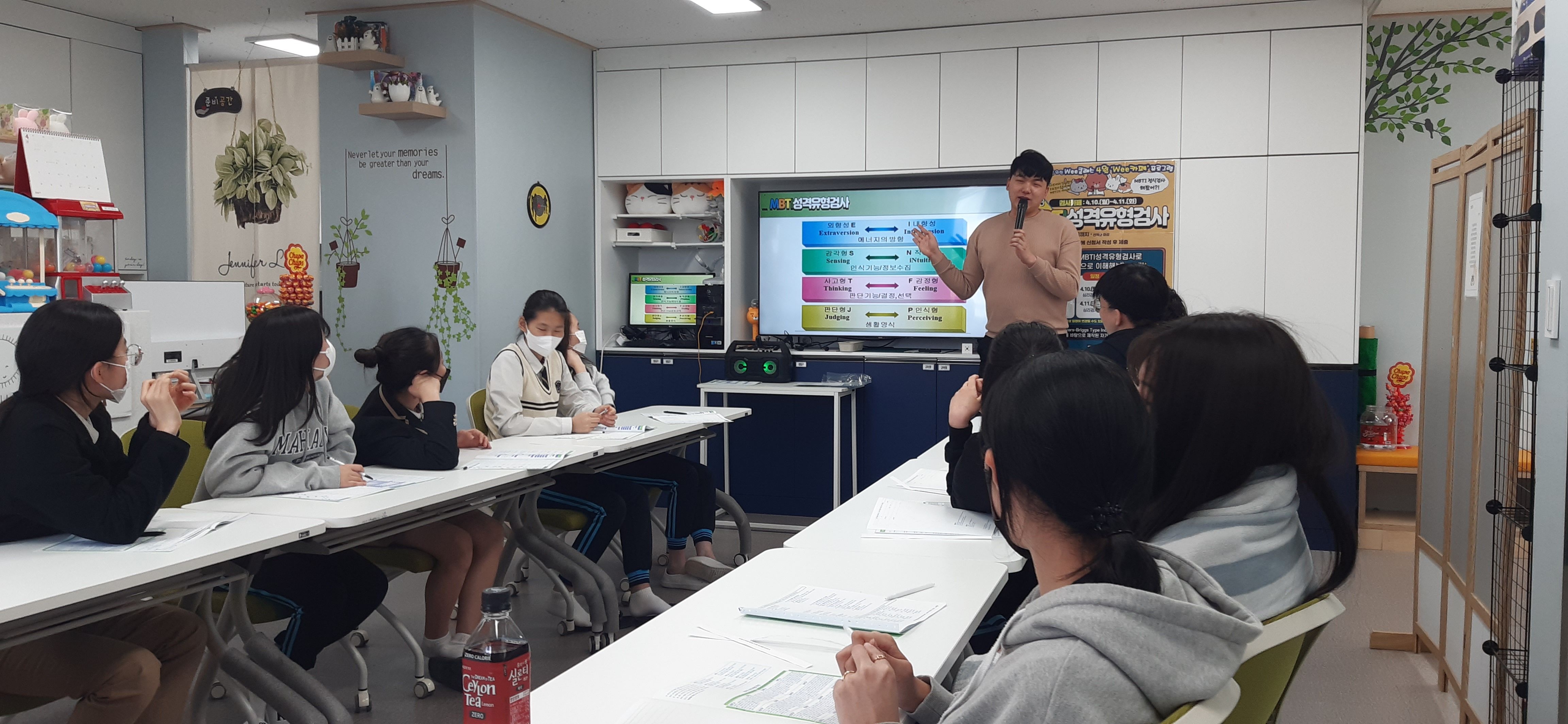 학생들이 관심을 많이 가지는 MBTI성격유형검사를 활용한 '검사카페'를 운영하였고, 인터넷으로 떠도는 가짜검사가 아닌 정식문항을 가진 MBTI성격유형검사로 자신의 성격유형을 조금더 정확하게 측정해보는 시간과 해설을 통해 자신의 유형을 진지하게 알아보는 시간을 가졌습니다.