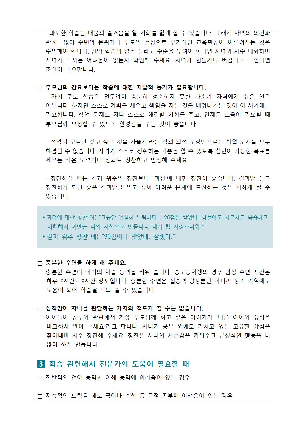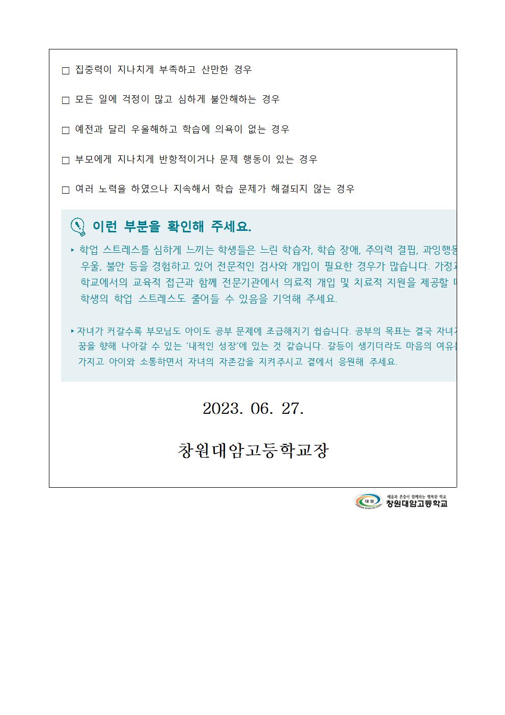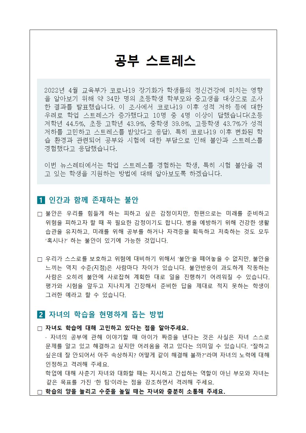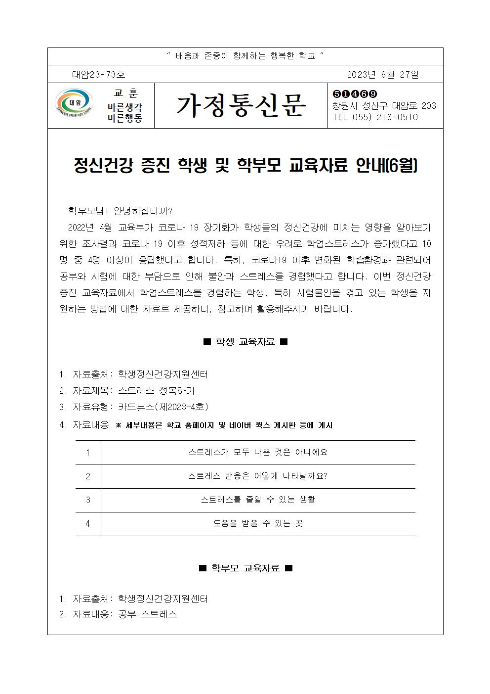 정신건강 증진 학생 및 학부모 교육자료 안내(6월)