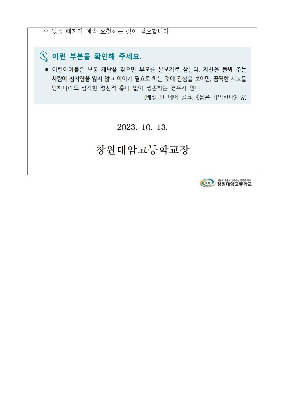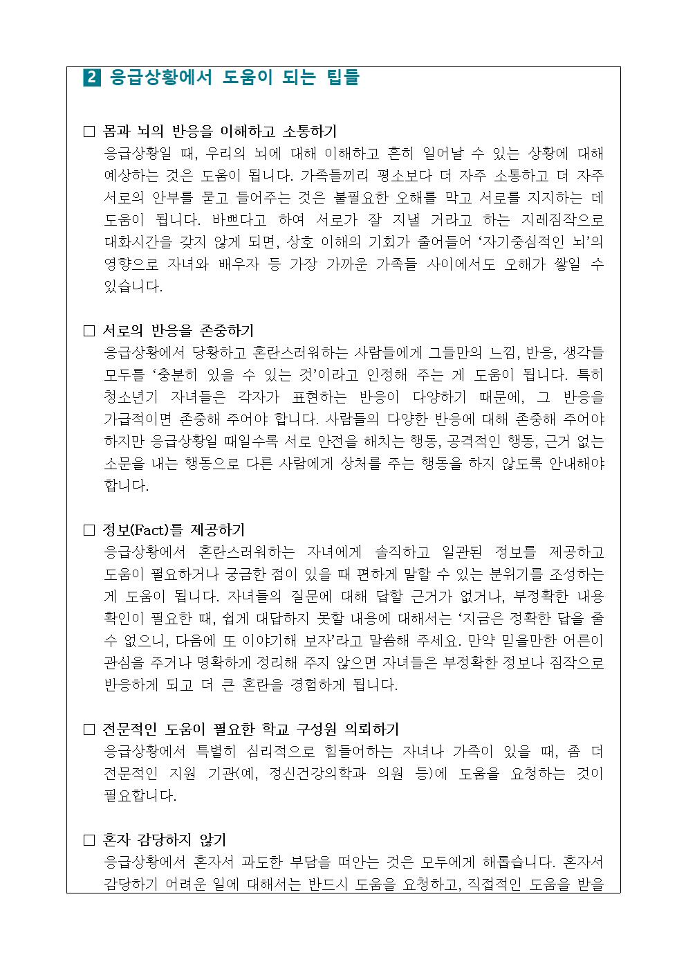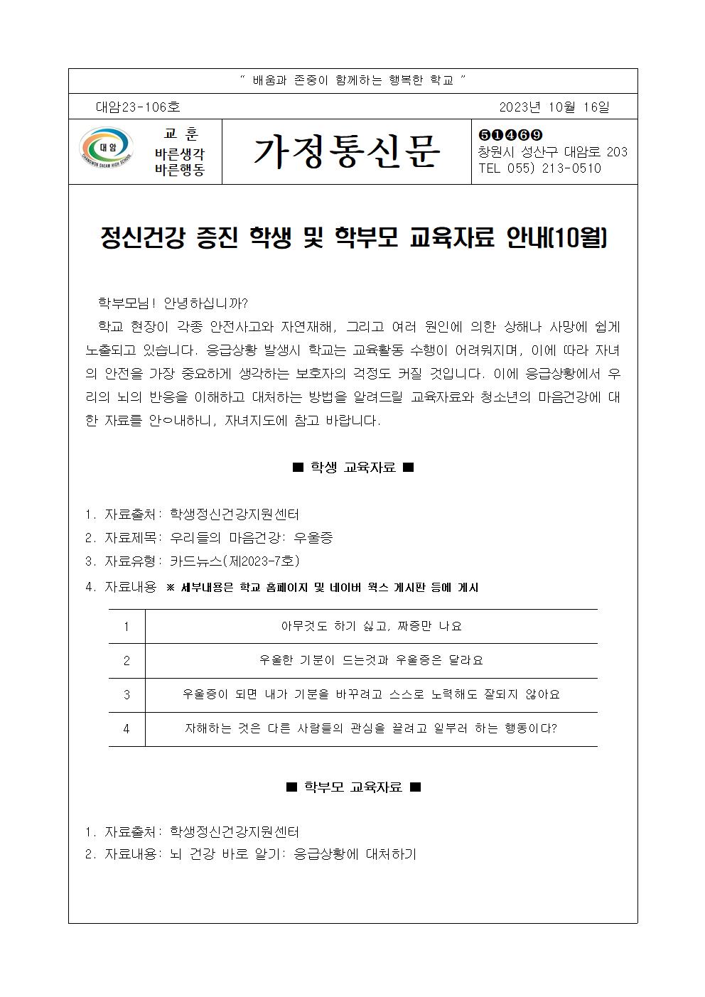 정신건강 증진 학생 및 학부모 교육자료 안내(10월)