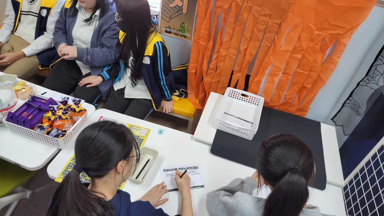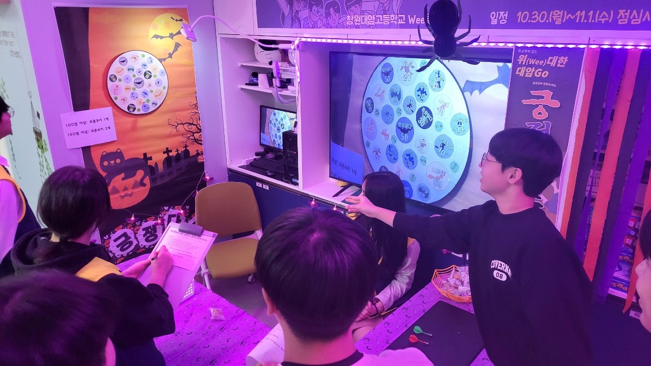 운영기간: 2023. 10.30.(월)~11.1.(수)(3일간) 운영시간: 점심시간 운영장소: 4층 Wee클래스 및 학생휴게실 운영내용 1) 텔레파시: 소통공감 활동 2) 긍정다트: 행복감 증진 활동 3) 행운뽑기: 우정, 친구사랑 활동 4) 학교폭력 4행시: 학교폭력 예방 활동 5) 딱지치기: 용기, 도전 활동 6) 반장미션: 공동체, 리더십 활동